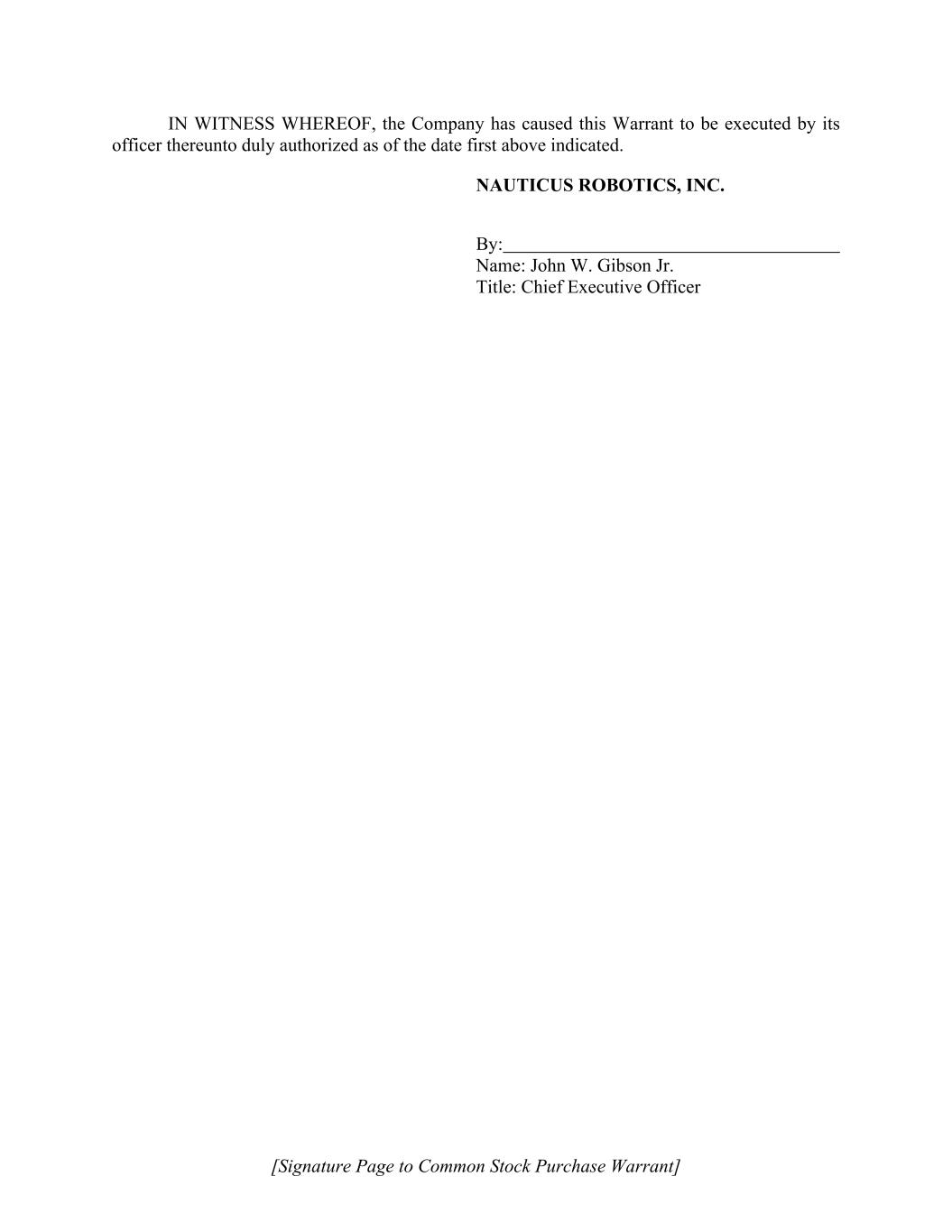 [Signature Page to Common Stock Purchase Warrant] IN WITNESS WHEREOF, the Company has caused this Warrant to be executed by its officer thereunto duly authorized as of the date first above indicated. NAUTICUS ROBOTICS, INC. By: Name: John W. Gibson Jr. Title: Chief Executive Officer
