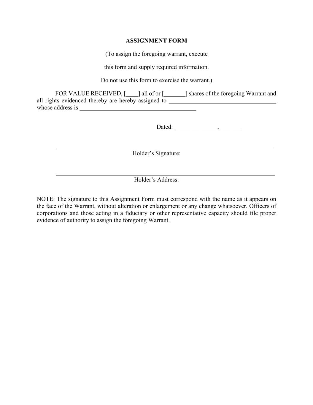 ASSIGNMENT FORM (To assign the foregoing warrant, execute this form and supply required information. Do not use this form to exercise the warrant.) FOR VALUE RECEIVED, [____] all of or [_______] shares of the foregoing Warrant and all rights evidenced thereby are hereby assigned to ___________________________________ whose address is ______________________________________ Dated: ______________, _______ Holder’s Signature: Holder’s Address: NOTE: The signature to this Assignment Form must correspond with the name as it appears on the face of the Warrant, without alteration or enlargement or any change whatsoever. Officers of corporations and those acting in a fiduciary or other representative capacity should file proper evidence of authority to assign the foregoing Warrant.