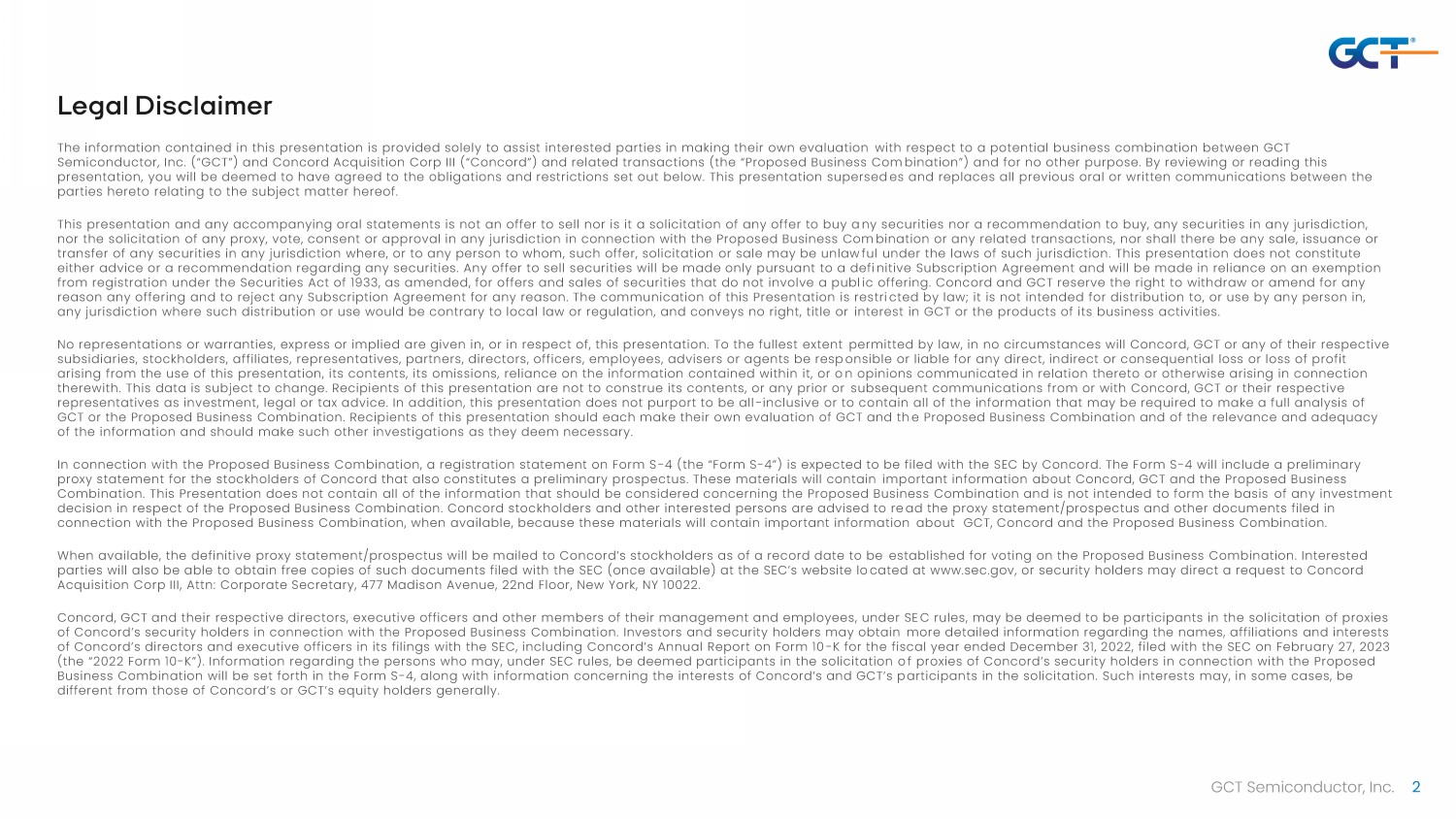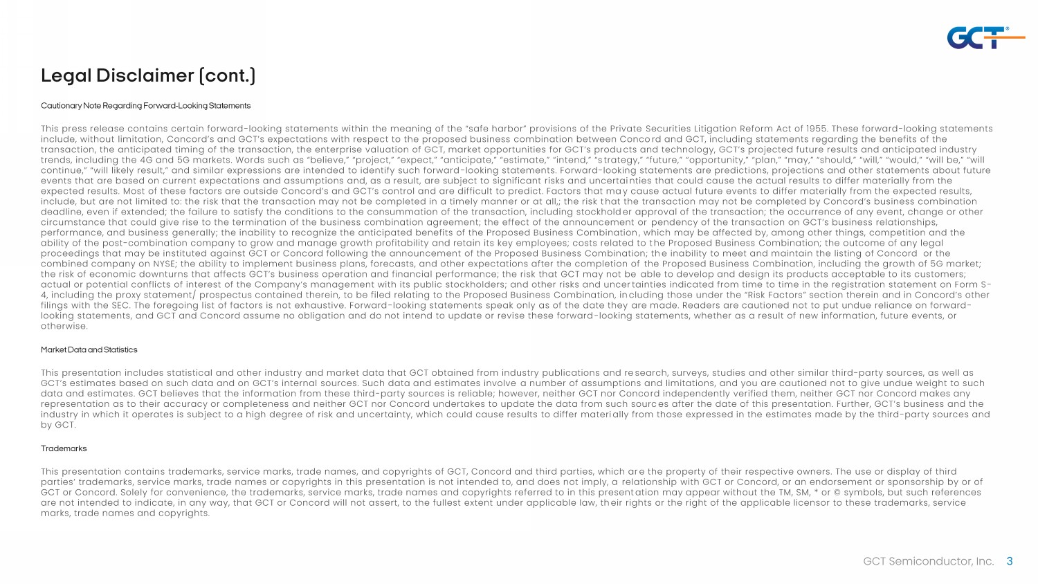 GCT Semiconductor, Inc. 2 Legal Disclaimer The information contained in this presentation is provided solely to assist interested parties in making their own evaluation wi th respect to a potential business combination between GCT Semiconductor, Inc. (“GCT”) and Concord Acquisition Corp III (“Concord”) and related transactions (the “Proposed Business Com bin ation”) and for no other purpose. By reviewing or reading this presentation, you will be deemed to have agreed to the obligations and restrictions set out below. This presentation supersed es and replaces all previous oral or written communications between the parties hereto relating to the subject matter hereof. This presentation and any accompanying oral statements is not an offer to sell nor is it a solicitation of any offer to buy a ny securities nor a recommendation to buy, any securities in any jurisdiction, nor the solicitation of any proxy, vote, consent or approval in any jurisdiction in connection with the Proposed Business Com bin ation or any related transactions, nor shall there be any sale, issuance or transfer of any securities in any jurisdiction where, or to any person to whom, such offer, solicitation or sale may be unlaw ful under the laws of such jurisdiction. This presentation does not constitute either advice or a recommendation regarding any securities. Any offer to sell securities will be made only pursuant to a defi nit ive Subscription Agreement and will be made in reliance on an exemption from registration under the Securities Act of 1933, as amended, for offers and sales of securities that do not involve a publ ic offering. Concord and GCT reserve the right to withdraw or amend for any reason any offering and to reject any Subscription Agreement for any reason. The communication of this Presentation is restri cte d by law; it is not intended for distribution to, or use by any person in, any jurisdiction where such distribution or use would be contrary to local law or regulation, and conveys no right, title or int erest in GCT or the products of its business activities. No representations or warranties, express or implied are given in, or in respect of, this presentation. To the fullest extent pe rmitted by law, in no circumstances will Concord, GCT or any of their respective subsidiaries, stockholders, affiliates, representatives, partners, directors, officers, employees, advisers or agents be resp ons ible or liable for any direct, indirect or consequential loss or loss of profit arising from the use of this presentation, its contents, its omissions, reliance on the information contained within it, or o n o pinions communicated in relation thereto or otherwise arising in connection therewith. This data is subject to change. Recipients of this presentation are not to construe its contents, or any prior or sub sequent communications from or with Concord, GCT or their respective representatives as investment, legal or tax advice. In addition, this presentation does not purport to be all - inclusive or to co ntain all of the information that may be required to make a full analysis of GCT or the Proposed Business Combination. Recipients of this presentation should each make their own evaluation of GCT and th e P roposed Business Combination and of the relevance and adequacy of the information and should make such other investigations as they deem necessary. In connection with the Proposed Business Combination, a registration statement on Form S - 4 (the “Form S - 4”) is expected to be fi led with the SEC by Concord. The Form S - 4 will include a preliminary proxy statement for the stockholders of Concord that also constitutes a preliminary prospectus. These materials will contain imp ortant information about Concord, GCT and the Proposed Business Combination. This Presentation does not contain all of the information that should be considered concerning the Proposed Business Combination and is not intended to form the basis of any investment decision in respect of the Proposed Business Combination. Concord stockholders and other interested persons are advised to re ad the proxy statement/prospectus and other documents filed in connection with the Proposed Business Combination, when available, because these materials will contain important information ab out GCT, Concord and the Proposed Business Combination. When available, the definitive proxy statement/prospectus will be mailed to Concord’s stockholders as of a record date to be est ablished for voting on the Proposed Business Combination. Interested parties will also be able to obtain free copies of such documents filed with the SEC (once available) at the SEC’s website lo cat ed at www.sec.gov, or security holders may direct a request to Concord Acquisition Corp III, Attn: Corporate Secretary, 477 Madison Avenue, 22nd Floor, New York, NY 10022. Concord, GCT and their respective directors, executive officers and other members of their management and employees, under SE C r ules, may be deemed to be participants in the solicitation of proxies of Concord’s security holders in connection with the Proposed Business Combination. Investors and security holders may obtain mo re detailed information regarding the names, affiliations and interests of Concord’s directors and executive officers in its filings with the SEC, including Concord’s Annual Report on Form 10 - K for th e fiscal year ended December 31, 2022, filed with the SEC on February 27, 2023 (the “2022 Form 10 - K”). Information regarding the persons who may, under SEC rules, be deemed participants in the solicitation o f proxies of Concord’s security holders in connection with the Proposed Business Combination will be set forth in the Form S - 4, along with information concerning the interests of Concord’s and GCT’s p articipants in the solicitation. Such interests may, in some cases, be different from those of Concord’s or GCT’s equity holders generally.