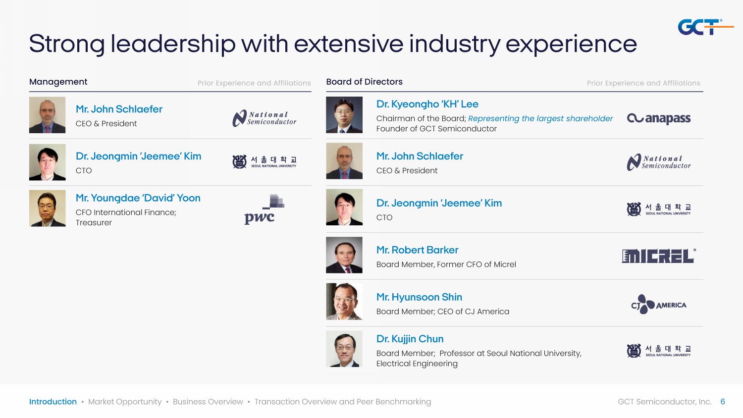 GCT Semiconductor, Inc. Concord Acquisition Corp III overview 5 What Attracted Concord to GCT? Concord Seeks a Long - Term Partnership Concord/Sponsor Management Differentiated sponsor alignment structure to deliver a significant value to all stakeholders over time x Sponsor group committed to the continued growth of GCT and its leading partnerships x Existing investor support of GCT through transaction and into the public markets x Deep relationships with industry - leading investors and long - term partners x Seasoned management team with deep expertise in the wireless connectivity space x Strong patent and intellectual property portfolio x Highly attractive TAM and high barrier to entry x Proven ability to support major wireless programs and full scale 5G rollout plan of secured OEM & operator development agreements x Jeff Tuder , CEO ▪ Mr. Tuder has served as Chief Executive of Concord III since February 2021 ▪ Mr. Tuder is the founder of Tremson Capital Management, investing in undervalued public and private companies ▪ Previously held various investment positions, including at JHL Capital Group, a $3 billion multi - strategy hedge fund David Schamis , CIO, Atlas Merchant Capital ▪ Mr. Schamis is a founding partner of Atlas Merchant Capital ▪ From 2000 until 2014, Mr. Schamis worked as a managing director at J.C. Flowers investing in North America, South America, Europe, and Asia ▪ Prior to J.C. Flowers, he worked at Salomon Smith Barney from 1995 until 2000 Bob Diamond , Chairman of the Board of Directors ▪ Mr. Diamond is a Founding Partner of Atlas Merchant Capital ▪ Until 2012, Mr. Diamond was the CEO of Barclays, previously having held positions as an executive director and member of the Barclays Executive Committee ▪ Prior to Barclays, Mr. Diamond held senior executive positions at Credit Suisse First Boston and Morgan Stanley in the US, Europe, and Asia Introduction • Market Opportunity • Business Overview • Transaction Overview and Peer Benchmarking