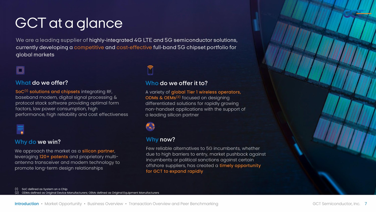 GCT Semiconductor, Inc. shareholder Management Mr. John Schlaefer CEO & President Dr. Jeongmin ‘Jeemee’ Kim CTO Mr. Youngdae ‘David’ Yoon CFO International Finance; Treasurer Board of Directors Dr. Kyeongho ‘KH’ Lee Chairman of the Board; Representing the largest Founder of GCT Semiconductor Mr. John Schlaefer CEO & President Dr. Jeongmin ‘Jeemee’ Kim CTO Mr. Robert Barker Board Member, Former CFO of Micrel Mr. Hyunsoon Shin Board Member; CEO of CJ America Dr. Kujjin Chun Board Member; Professor at Seoul National University, Electrical Engineering 6 Strong leadership with extensive industry experience Prior Experience and Affiliations Prior Experience and Affiliations Introduction • Market Opportunity • Business Overview • Transaction Overview and Peer Benchmarking
