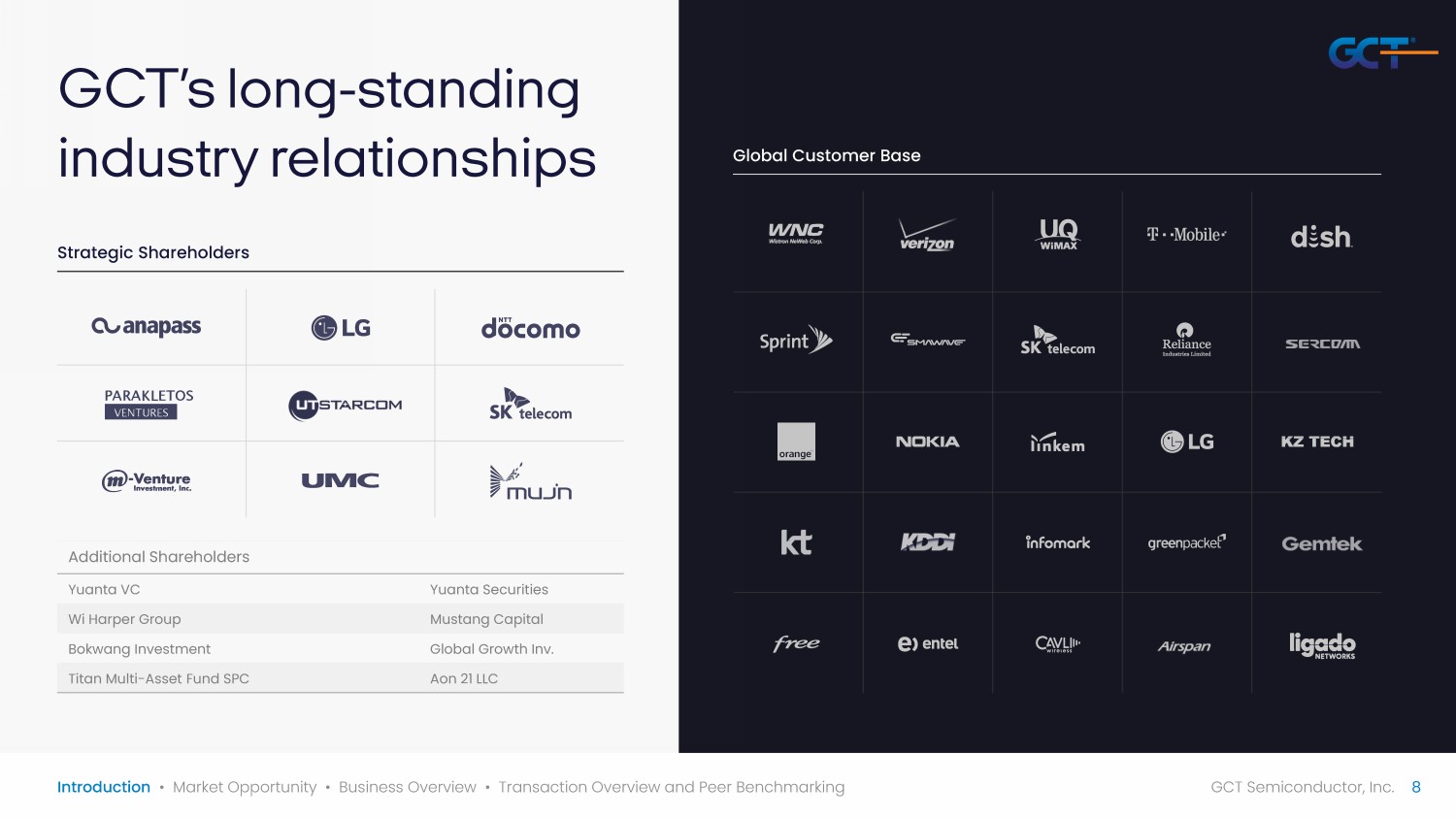 GCT Semiconductor, Inc. 7 GCT at a glance We are a leading supplier of highly - integrated 4G LTE and 5G semiconductor solutions, currently developing a competitive and cost - effective full - band 5G chipset portfolio for global markets What do we offer? SoC (1) solutions and chipsets integrating RF, baseband modem, digital signal processing & protocol stack software providing optimal form factors, low power consumption, high performance, high reliability and cost effectiveness Why now? Few reliable alternatives to 5G incumbents, whether due to high barriers to entry, market pushback against incumbents or political sanctions against certain offshore suppliers, has created a timely opportunity for GCT to expand rapidly Who do we offer it to? A variety of global Tier 1 wireless operators, ODMs & OEMs (2) focused on designing differentiated solutions for rapidly growing non - handset applications with the support of a leading silicon partner Why do we win? We approach the market as a silicon partner , leveraging 120+ patents and proprietary multi - antenna transceiver and modem technology to promote long - term design relationships Introduction • Market Opportunity • Business Overview • Transaction Overview and Peer Benchmarking (1) SoC defined as System on a Chip (2) ODMs defined as Original Device Manufacturers; OEMs defined as Original Equipment Manufacturers