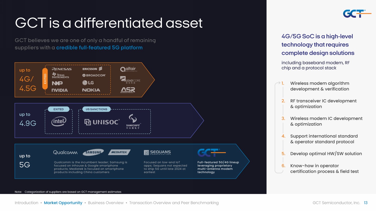 GCT Semiconductor, Inc. 12 Powerful market forces favor GCT’s strategic positioning GCT’s full - stack technology platform and market neutrality coincide with 5G market tailwinds: Emerging use cases requiring 5G’s low - latency Streaming, AR/VR, industrial automation, Artificial Intelligence Structural ▪ GCT Management believes there are no established alternatives in the West to Qualcomm for full - featured 5G SoCs ▪ GCT believes carriers’ post - paid mobile plans are no longer a meaningful growth driver, forcing them to explore new business models Political ▪ Infrastructure Investment and Jobs Act of 2021 ▪ Technological and political decoupling with China “As we start to see more 5G chipsets getting embedded in edge equipment, not just devices that we use with our hands, I think you're going to begin to see a larger growing revenue stream from the 5G spectrum deployed in the enterprise space with those basic services. It doesn't require a lot of really high science in private networking, for example, to achieve that monetization. I'm encouraged because that's the trends that I'm seeing in the discussions with our largest enterprise accounts.” (1) – Jeffery Scott McElfresh, AT&T COO (1) Jeffery Scott McElfresh, 2023 Morgan Stanley TMT Conference Introduction • Market Opportunity • Business Overview • Transaction Overview and Peer Benchmarking