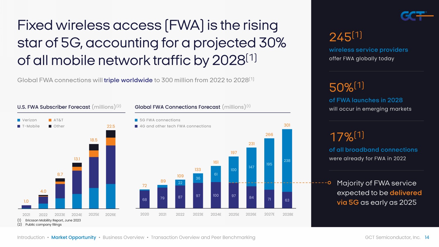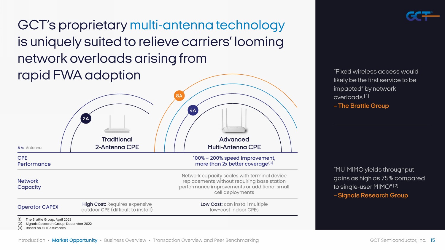 GCT Semiconductor, Inc. 68 79 87 97 100 97 84 71 63 22 36 61 100 147 195 238 2021 2022 2023E 2024E 2025E 2026E 2027E 2028E 2020 2021 2022 2023E 2024E 2025E 2026E 14 Fixed wireless access (FWA) is the rising star of 5G, accounting for a projected 30% of all mobile network traffic by 2028 (1) Global FWA connections will triple worldwide to 300 million from 2022 to 2028 (1) 245 (1) wireless service providers offer FWA globally today 50% (1) of FWA launches in 2028 will occur in emerging markets 17% (1) of all broadband connections were already for FWA in 2022 Global FWA Connections Forecast (millions) (1) U.S. FWA Subscriber Forecast (millions) (2) 266 301 231 197 161 133 109 89 72 5G FWA connections 4G and other tech FWA connections Verizon T - Mobile AT&T Other 1.0 4.0 8.7 13.1 18.5 22.5 Majority of FWA service expected to be delivered via 5G as early as 2025 (1) Ericsson Mobility Report, June 2023 (2) Public company filings Introduction • Market Opportunity • Business Overview • Transaction Overview and Peer Benchmarking