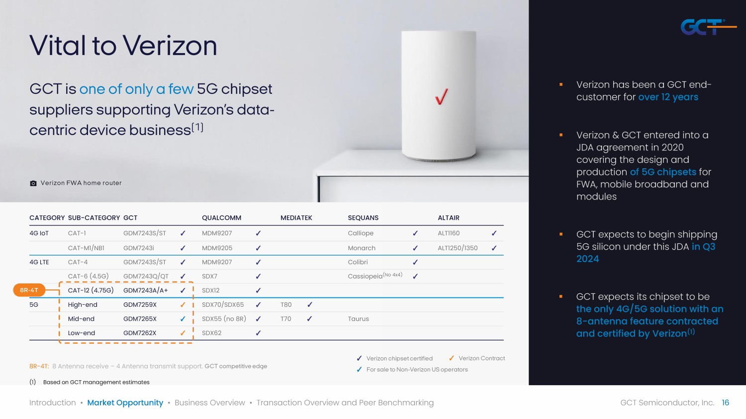 GCT Semiconductor, Inc. 8A 15 GCT’s proprietary multi - antenna technology is uniquely suited to relieve carriers’ looming network overloads arising from rapid FWA adoption Traditional 2 - Antenna CPE Advanced Multi - Antenna CPE CPE Performance 100% ~ 200% speed improvement, more than 2x better coverage (3) Network Capacity Network capacity scales with terminal device replacements without requiring base station performance improvements or additional small cell deployments Operator CAPEX High Cost: Requires expensive outdoor CPE (difficult to install) Low Cost: can install multiple low - cost indoor CPEs #A: Antenna 2A 4A “Fixed wireless access would likely be the first service to be impacted” by network overloads (1) – The Brattle Group “MU - MIMO yields throughput gains as high as 75% compared to single - user MIMO ” (2) – Signals Research Group (1) The Brattle Group, April 2023 (2) Signals Research Group, December 2022 (3) Based on GCT estimates Introduction • Market Opportunity • Business Overview • Transaction Overview and Peer Benchmarking