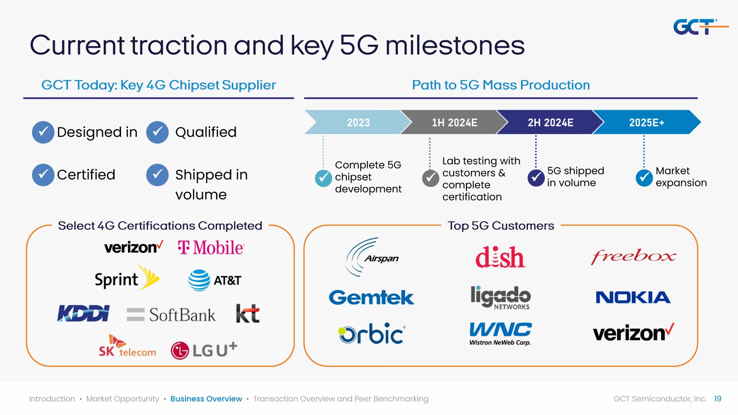 GCT Semiconductor, Inc. 18 An established wireless silicon vendor with a long history of successful commercializations 4G CAT3 4G CAT4 4G CAT4 + AP 4.5G CAT6 4.75G CAT12 USB dongle CAT3 Smartphone Mobile router Module CAT4 Outdoor CPE Smart meter eMBMS tablet Mobile router CAT4 Mobile router WX04 CAT12 Mobile router WX05 Indoor CPE Home 01 Mobile router WX06 Mobile router CAT4 Indoor CPE USB dongle Indoor UE relay MagicBox Gen1 CAT6 Mobile router CAT4 M2M CPE Beam projector M2M CPE CAT1 VoLTE Box CAT6 Mobile router CAT12 Mobile router WX01 CAT6 Mobile router WX02 Indoor CPE Outdoor UE relay Mini Macor Gen2 CAT12 Sprint MagicBox Sprint Trebl TM AI Speaker CAT4 AI Translator Mobile router CAT6 Introduction • Market Opportunity • Business Overview • Transaction Overview and Peer Benchmarking