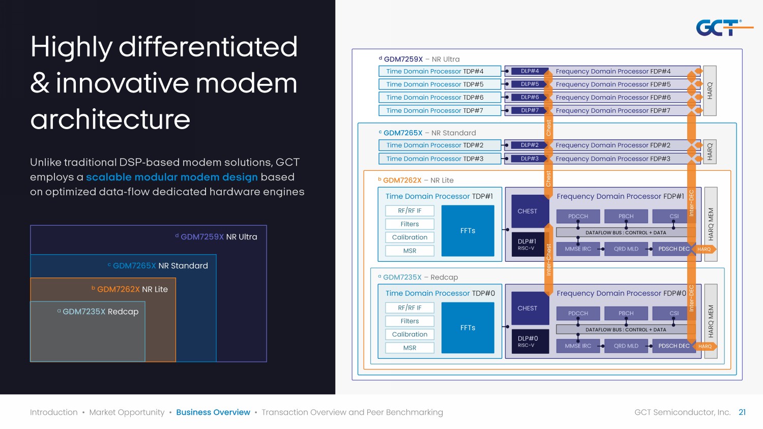 GCT Semiconductor, Inc. In Production 2024E 2025E Q1 Q2 Q3 Q4 Q1 Q2 Q3 Q4 Low cost eMBB, URLLC NR Ultra GDM7259X Rel16/17 8CA 5G Modem + 4G CAT19 Octa Core CPU – 8nm High performance eMBB, URLLC NR Standard GDM7265X Rel16/17 4CA 5G Modem + 4G CAT15 Octa Core CPU – 8nm Main stream eMBB, URLLC 20 4G portfolio and anticipated 5G roadmap GDM7243 A/A+ 4G CAT12, 2CA 4x4MIMO, 8Rx, 28nm GDM7243Q 4G CAT7, 4x4MIMO, 28nm In Production Development Planning NR Redcap GDM7235X Rel17 Redcap 5G Modem + 4G CAT4 Quad Core CPU – 8nm 5G IoT RedCap NR Standard+ GDM7275X Rel17 6CA 1024QAM 5G Modem + 4G CAT15 Octa Core CPU – ≤ 8nm High performance eMBB, URLLC Main stream eMBB, URLLC GDM7243i 4G CAT - M1/CAT - NB1, 40nm GDM7243S 4G CAT1/4, Dual CPU, 40nm Introduction • Market Opportunity • Business Overview • Transaction Overview and Peer Benchmarking NR Lite GDM7262X Rel17 2CA 5G Modem + 4G CAT7 Quad Core CPU – 8nm