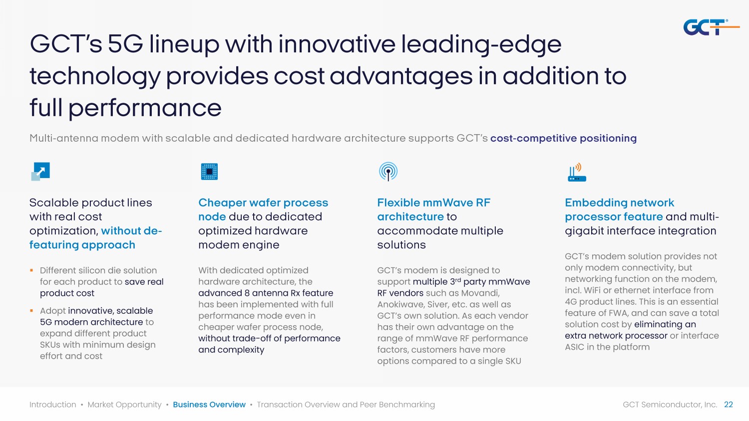 GCT Semiconductor, Inc. 21 Highly differentiated & innovative modem architecture Unlike traditional DSP - based modem solutions, GCT employs a scalable modular modem design based on optimized data - flow dedicated hardware engines d GDM7259X NR Ultra c GDM7265X NR Standard b GDM7262X NR Lite a GDM72 35 X Redcap a GDM7235X – Redcap FFT s Time Domain Processor TDP#0 RF/RF IF Filters Calibration MSR HARQ MEM MMSE IRC QRD MLD PDSCH DEC CHEST Frequency Domain Processor FDP#0 DLP#0 RISC - V PDCCH PBCH CSI DATAFLOW BUS : CONTROL + DATA b GDM7262X – NR Lite FFT s Time Domain Processor TDP#1 RF/RF IF Filters Calibration MSR HARQ MEM MMSE IRC QRD MLD PDSCH DEC CHEST Frequency Domain Processor FDP#1 DLP#1 RISC - V PDCCH PBCH CSI DATAFLOW BUS : CONTROL + DATA Time Domain Processor TDP#2 c GDM7265X – NR Standard Time Domain Processor TDP#3 Frequency Domain Processor FDP#2 DLP#2 Frequency Domain Processor FDP#3 DLP#3 HARQ d GDM7259X – NR Ultra Time Domain Processor TDP#5 Frequency Domain Processor FDP#4 DLP#4 Frequency Domain Processor FDP#5 DLP#5 HARQ Time Domain Processor TDP#6 Time Domain Processor TDP#7 Frequency Domain Processor FDP#6 DLP#6 Frequency Domain Processor FDP#7 DLP#7 Time Domain Processor TDP#4 Chest Inter - Chest Chest Inter - DEC Inter - DEC HARQ HARQ Introduction • Market Opportunity • Business Overview • Transaction Overview and Peer Benchmarking