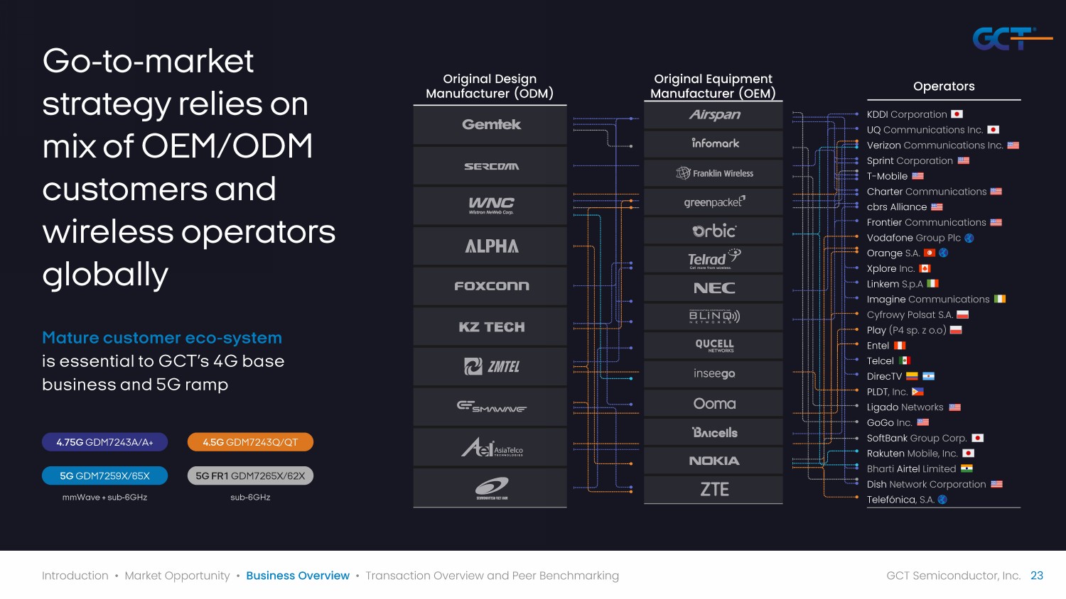 GCT Semiconductor, Inc. 22 GCT’s 5G lineup with innovative leading - edge technology provides cost advantages in addition to full performance Multi - antenna modem with scalable and dedicated hardware architecture supports GCT’s cost - competitive positioning Scalable product lines with real cost optimization, without de - featuring approach ▪ Different silicon die solution for each product to save real product cost ▪ Adopt innovative, scalable 5G modern architecture to expand different product SKUs with minimum design effort and cost Cheaper wafer process node due to dedicated optimized hardware modem engine With dedicated optimized hardware architecture, the advanced 8 antenna Rx feature has been implemented with full performance mode even in cheaper wafer process node, without trade - off of performance and complexity Flexible mmWave RF architecture to accommodate multiple solutions GCT’s modem is designed to support multiple 3 rd party mmWave RF vendors such as Movandi, Anokiwave, Siver, etc. as well as GCT’s own solution. As each vendor has their own advantage on the range of mmWave RF performance factors, customers have more options compared to a single SKU Embedding network processor feature and multi - gigabit interface integration GCT’s modem solution provides not only modem connectivity, but networking function on the modem, incl. WiFi or ethernet interface from 4G product lines. This is an essential feature of FWA, and can save a total solution cost by eliminating an extra network processor or interface ASIC in the platform Introduction • Market Opportunity • Business Overview • Transaction Overview and Peer Benchmarking