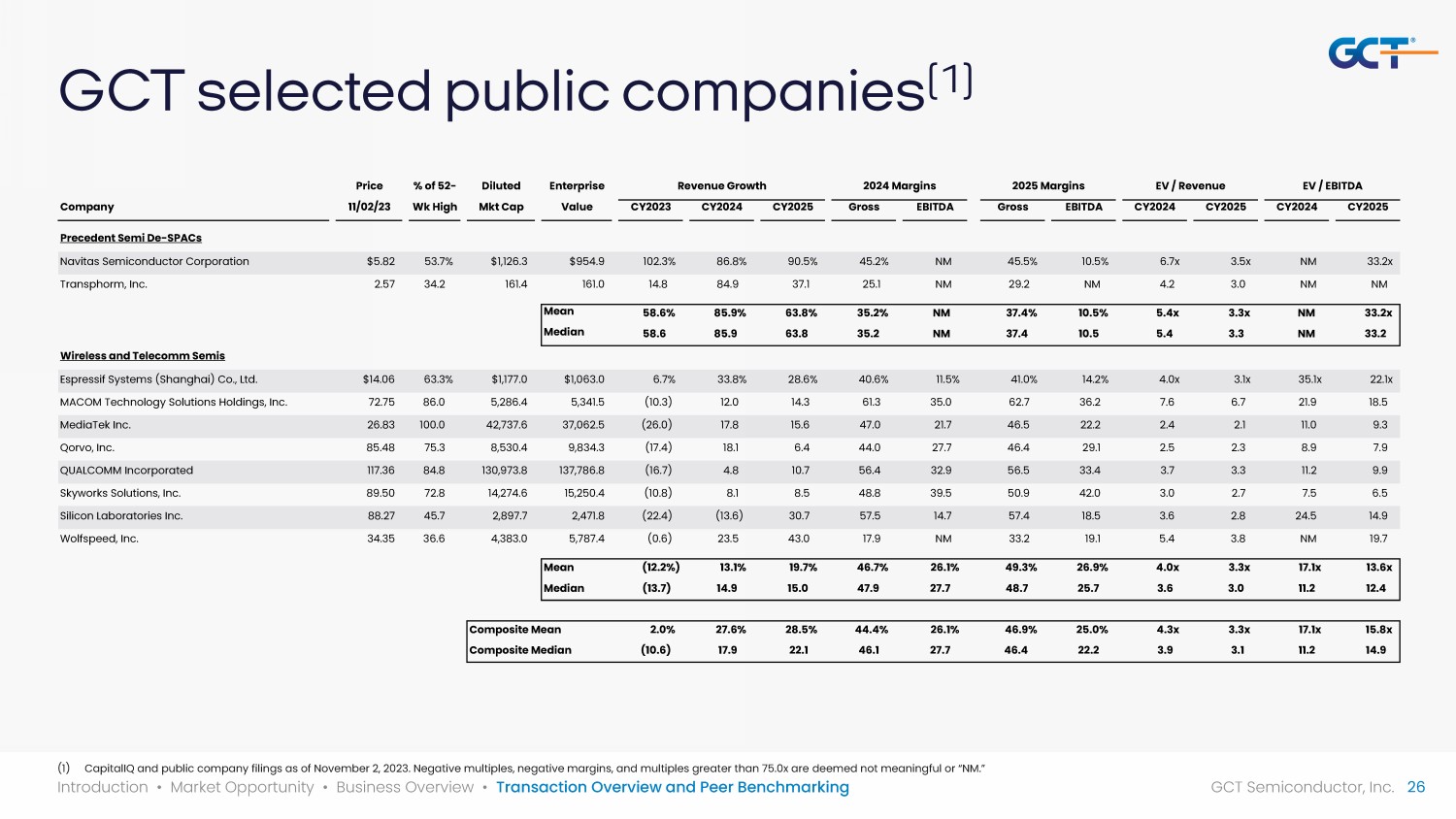 GCT Semiconductor, Inc. 25 Transaction overview Pro Forma Ownership Transaction Highlights Sources and Uses (e) PF Shares Ownership GCT Rollover Equity Shareholders (b)(c) 31.0 64.3% PIPE Investors (g) 7.9 16.3% CNDB Initial Stockholders (f) 5.3 11.0% CNDB Public Shareholders (d) 4.0 8.4% Pro Forma Total Shares Outstanding 48.2 100.0% Total Equity Value @ $10.00 / share $482 Less: Pro Forma Net Cash (c)(e) (21) Pro Forma TEV $461 Sources Common Stock Issued to GCT at Close (b)(c) $310 PIPE 43 Cash Held in Trust (d) 43 Rollover of Existing Debt (c) 40 Total Sources $437 Uses Common Stock Issued to GCT at Close (b)(c) $310 Cash to Pro Forma Balance Sheet 62 Rollover of Existing Debt (c) 40 Total Estimated Transaction Expenses 25 Total Uses $437 ▪ $661M pro forma enterprise value to the market including up to 20.0M of performance - based earnout shares to existing GCT shareholders vesting equally over three tranches: share price triggers of (1) $12.50, (2) $15.00, (3) $17.50 (a) ▪ $461M pro forma enterprise value to the market at close (b) ▪ $62M pro forma cash on balance sheet assumes: $43M PIPE from existing and new investors, up to $43M in cash held in SPAC trust, and $25M of transaction expenses (c)(d) ▪ Significant sponsor alignment with 1.9M (22%) founder shares subject to forfeiture and 30% of private placement warrants forfeited at close ▪ GCT rollover equity shareholders will retain at least ~64% ownership at close (b)(d) ($USD in Millions, except share price) (a) GCT earnout triggers hit when share price exceeds threshold for 20/30 trading d ays beginning 90 trading days post - close and with measurement period starting 60 days post - close. (b) Excludes 20.0M GCT earnout shares. $310M valuation includes aggregate vested ESOP on a net - exercised basis and $46M conversion of outstanding convertible notes. (c) Ass umes $40.2M of existing net debt post conversion of convertible debt. (d) Assumes 0% redemptions of $43M trust and includes int erest. (e) Numbers may not tie due to rounding. (f) Assumes 62% of founder shares (“FS”) and 40% of private warrants vesting at close, ~1.9M (22 .5%) of Sponsor’s FS and 30% of private warrants used to incentivize capital commitments. 30% of private warrants forfeited a t c lose and ~1.9M (22.5%) of Sponsor’s FS subject to forfeiture. (g) PIPE ownership reflects transfer of ~1.4M incentive founder shares but does not incl ude out - of - the - money incentive warrants. PIPE investor commitments participating at 33% discount to deal value with portion of inve stment that funds as pre - close CVT converting concurrent with close. Introduction • Market Opportunity • Business Overview • Transaction Overview and Peer Benchmarking 64.3% 16.3% 11.0% 8.4% GCT Rollover Equity Shareholders Common PIPE Investors CNDB Initial Shareholders CNDB Public Shareholders