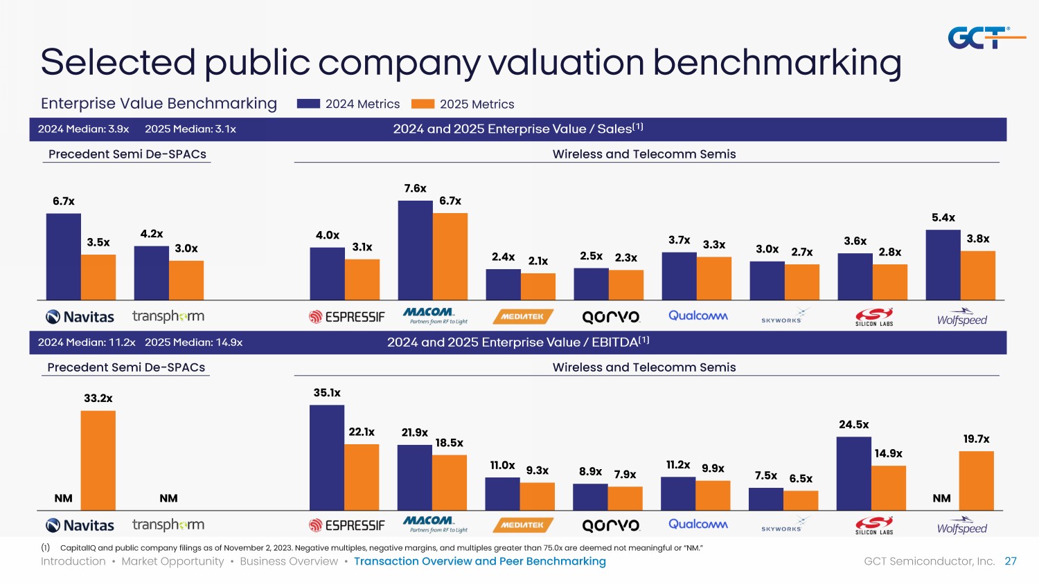 GCT Semiconductor, Inc. GCT selected public companies (1) 26 Introduction • Market Opportunity • Business Overview • Transaction Overview and Peer Benchmarking GCT Semiconductor, Inc. (1) CapitalIQ and public company filings as of November 2, 2023. Negative multiples, negative margins, and multiples greater than 75 .0x are deemed not meaningful or “NM.” Price % of 52- Diluted Enterprise Revenue Growth 2024 Margins 2025 Margins EV / Revenue EV / EBITDA Company 11/02/23 Wk High Mkt Cap Value CY2023 CY2024 CY2025 Gross EBITDA Gross EBITDA CY2024 CY2025 CY2024 CY2025 Precedent Semi De-SPACs Navitas Semiconductor Corporation $5.82 53.7% $1,126.3 $954.9 102.3% 86.8% 90.5% 45.2% NM 45.5% 10.5% 6.7x 3.5x NM 33.2x Transphorm, Inc. 2.57 34.2 161.4 161.0 14.8 84.9 37.1 25.1 NM 29.2 NM 4.2 3.0 NM NM Mean 58.6% 85.9% 63.8% 35.2% NM 37.4% 10.5% 5.4x 3.3x NM 33.2x Median 58.6 85.9 63.8 35.2 NM 37.4 10.5 5.4 3.3 NM 33.2 Wireless and Telecomm Semis Espressif Systems (Shanghai) Co., Ltd. $14.06 63.3% $1,177.0 $1,063.0 6.7% 33.8% 28.6% 40.6% 11.5% 41.0% 14.2% 4.0x 3.1x 35.1x 22.1x MACOM Technology Solutions Holdings, Inc. 72.75 86.0 5,286.4 5,341.5 (10.3) 12.0 14.3 61.3 35.0 62.7 36.2 7.6 6.7 21.9 18.5 MediaTek Inc. 26.83 100.0 42,737.6 37,062.5 (26.0) 17.8 15.6 47.0 21.7 46.5 22.2 2.4 2.1 11.0 9.3 Qorvo, Inc. 85.48 75.3 8,530.4 9,834.3 (17.4) 18.1 6.4 44.0 27.7 46.4 29.1 2.5 2.3 8.9 7.9 QUALCOMM Incorporated 117.36 84.8 130,973.8 137,786.8 (16.7) 4.8 10.7 56.4 32.9 56.5 33.4 3.7 3.3 11.2 9.9 Skyworks Solutions, Inc. 89.50 72.8 14,274.6 15,250.4 (10.8) 8.1 8.5 48.8 39.5 50.9 42.0 3.0 2.7 7.5 6.5 Silicon Laboratories Inc. 88.27 45.7 2,897.7 2,471.8 (22.4) (13.6) 30.7 57.5 14.7 57.4 18.5 3.6 2.8 24.5 14.9 Wolfspeed, Inc. 34.35 36.6 4,383.0 5,787.4 (0.6) 23.5 43.0 17.9 NM 33.2 19.1 5.4 3.8 NM 19.7 Mean (12.2%) 13.1% 19.7% 46.7% 26.1% 49.3% 26.9% 4.0x 3.3x 17.1x 13.6x Median (13.7) 14.9 15.0 47.9 27.7 48.7 25.7 3.6 3.0 11.2 12.4 Composite Mean 2.0% 27.6% 28.5% 44.4% 26.1% 46.9% 25.0% 4.3x 3.3x 17.1x 15.8x Composite Median (10.6) 17.9 22.1 46.1 27.7 46.4 22.2 3.9 3.1 11.2 14.9
