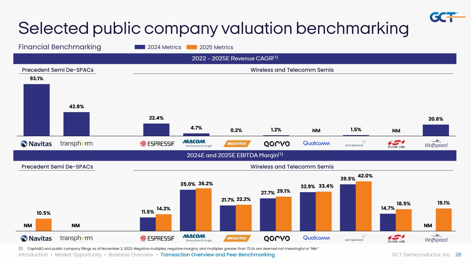 GCT Semiconductor, Inc. NM NM 35.1x 21.9x 11.0x 8.9x 11.2x 7.5x 24.5x NM 33.2x 22.1x 18.5x 9.3x 7.9x 9.9x 6.5x 14.9x 19.7x Selected public company valuation benchmarking 27 Enterprise Value Benchmarking 2024 and 2025 Enterprise Value / Sales (1) 2024 and 2025 Enterprise Value / EBITDA (1) Precedent Semi De - SPACs Wireless and Telecomm Semis Precedent Semi De - SPACs Wireless and Telecomm Semis Introduction • Market Opportunity • Business Overview • Transaction Overview and Peer Benchmarking (1) CapitalIQ and public company filings as of November 2, 2023. Negative multiples, negative margins, and multiples greater than 75 .0x are deemed not meaningful or “NM.” 6.7x 4.2x 4.0x 7.6x 2.4x 2.5x 3.7x 3.0x 3.6x 5.4x 3.5x 3.0x 3.1x 6.7x 2.1x 2.3x 3.3x 2.7x 2.8x 3.8x 2024 Metrics 2025 Metrics 2024 Median: 3.9x 2025 Median: 3.1x 2024 Median: 11.2x 2025 Median: 14.9x