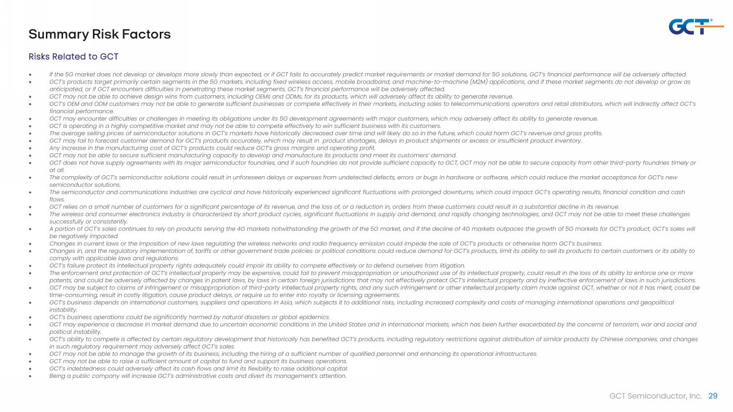 GCT Semiconductor, Inc. 29 Summary Risk Factors Risks Related to GCT If the 5G market does not develop or develops more slowly than expected, or if GCT fails to accurately predict market require men ts or market demand for 5G solutions, GCT’s financial performance will be adversely affected. GCT’s products target primarily certain segments in the 5G markets, including fixed wireless access, mobile broadband, and ma chi ne - to - machine (M2M) applications, and if these market segments do not develop or grow as anticipated, or if GCT encounters difficulties in penetrating these market segments, GCT’s financial performance will be adve rse ly affected. GCT may not be able to achieve design wins from customers, including OEMs and ODMs, for its products, which will adversely af fec t its ability to generate revenue. GCT’s OEM and ODM customers may not be able to generate sufficient businesses or compete effectively in their markets, includ ing sales to telecommunications operators and retail distributors, which will indirectly affect GCT’s financial performance. GCT may encounter difficulties or challenges in meeting its obligations under its 5G development agreements with major custom ers , which may adversely affect its ability to generate revenue. GCT is operating in a highly competitive market and may not be able to compete effectively to win sufficient business with it s c ustomers. The average selling prices of semiconductor solutions in GCT’s markets have historically decreased over time and will likely do so in the future, which could harm GCT’s revenue and gross profits. GCT may fail to forecast customer demand for GCT’s products accurately, which may result in product shortages, delays in pro duc t shipments or excess or insufficient product inventory. Any increase in the manufacturing cost of GCT’s products could reduce GCT’s gross margins and operating profit. GCT may not be able to secure sufficient manufacturing capacity to develop and manufacture its products and meet its customer s’ demand. GCT does not have supply agreements with its major semiconductor foundries, and if such foundries do not provide sufficient c apa city to GCT, GCT may not be able to secure capacity from other third - party foundries timely or at all. The complexity of GCT’s semiconductor solutions could result in unforeseen delays or expenses from undetected defects, errors or bugs in hardware or software, which could reduce the market acceptance for GCT’s new semiconductor solutions. The semiconductor and communications industries are cyclical and have historically experienced significant fluctuations with pro longed downturns, which could impact GCT’s operating results, financial condition and cash flows. GCT relies on a small number of customers for a significant percentage of its revenue, and the loss of, or a reduction in, or der s from these customers could result in a substantial decline in its revenue. The wireless and consumer electronics industry is characterized by short product cycles, significant fluctuations in supply a nd demand, and rapidly changing technologies, and GCT may not be able to meet these challenges successfully or consistently. A portion of GCT’s sales continues to rely on products serving the 4G markets notwithstanding the growth of the 5G market, an d i f the decline of 4G markets outpaces the growth of 5G markets for GCT’s product, GCT’s sales will be negatively impacted. Changes in current laws or the imposition of new laws regulating the wireless networks and radio frequency emission could imp ede the sale of GCT’s products or otherwise harm GCT’s business. Changes in, and the regulatory implementation of, tariffs or other government trade policies or political conditions could re duc e demand for GCT’s products, limit its ability to sell its products to certain customers or its ability to comply with applicable laws and regulations. GCT’s failure protect its intellectual property rights adequately could impair its ability to compete effectively or to defen d o urselves from litigation. The enforcement and protection of GCT’s intellectual property may be expensive, could fail to prevent misappropriation or una uth orized use of its intellectual property, could result in the loss of its ability to enforce one or more patents, and could be adversely affected by changes in patent laws, by laws in certain foreign jurisdictions that may not eff ect ively protect GCT’s intellectual property and by ineffective enforcement of laws in such jurisdictions. GCT may be subject to claims of infringement or misappropriation of third - party intellectual property rights, and any such infri ngement or other intellectual property claim made against GCT, whether or not it has merit, could be time - consuming, result in costly litigation, cause product delays, or require us to enter into royalty or licensing agreements. GCT’s business depends on international customers, suppliers and operations in Asia, which subjects it to additional risks, i ncl uding increased complexity and costs of managing international operations and geopolitical instability. GCT’s business operations could be significantly harmed by natural disasters or global epidemics. GCT may experience a decrease in market demand due to uncertain economic conditions in the United States and in international ma rkets, which has been further exacerbated by the concerns of terrorism, war and social and political instability. GCT’s ability to compete is affected by certain regulatory development that historically has benefited GCT’s products, includ ing regulatory restrictions against distribution of similar products by Chinese companies, and changes in such regulatory requirement may adversely affect GCT’s sales. GCT may not be able to manage the growth of its business, including the hiring of a sufficient number of qualified personnel and enhancing its operational infrastructu