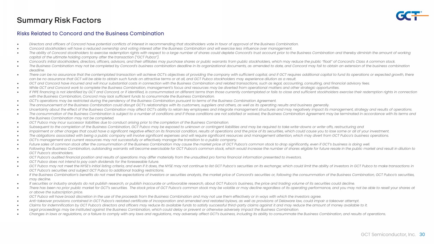 GCT Semiconductor, Inc. 30 Summary Risk Factors Risks Related to Concord and the Business Combination Directors and officers of Concord have potential conflicts of interest in recommending that stockholders vote in favor of app rov al of the Business Combination. Concord stockholders will have a reduced ownership and voting interest after the Business Combination and will exercise less inf luence over management. The ability of Concord stockholders to exercise redemption rights with respect to a large number of shares could deplete Conc ord ’s trust account prior to the Business Combination and thereby diminish the amount of working capital of the ultimate holding company after the transaction (“GCT Pubco”). Concord’s initial stockholders, directors, officers, advisors, and their affiliates may purchase shares or public warrants fr om public stockholders, which may reduce the public “float” of Concord’s Class A common stock. The Business Combination may not be completed by Concord’s business combination deadline in its organizational documents, as ame nded to date, and Concord may fail to obtain an extension of the business combination deadline. There can be no assurance that the contemplated transaction will achieve GCT’s objectives of providing the company with suffi cie nt capital, and if GCT requires additional capital to fund its operations or expected growth, there can be no assurance that GCT will be able to obtain such funds on attractive terms or at all, and GCT Pubco stockholders may exp erience dilution as a result. GCT and Concord have incurred and will incur substantial costs in connection with the Business Combination and related transa cti ons, such as legal, accounting, consulting, and financial advisory fees. While GCT and Concord work to complete the Business Combination, management’s focus and resources may be diverted from operat ion al matters and other strategic opportunities. If PIPE financing is not identified by GCT and Concord, or if identified, is consummated on different terms than those curren tly contemplated or fails to close and sufficient stockholders exercise their redemption rights in connection with the Business Combination, Concord may lack sufficient funds to consummate the Business Combination. GCT’s operations may be restricted during the pendency of the Business Combination pursuant to terms of the Business Combinat ion Agreement. The announcement of the Business Combination could disrupt GCT’s relationships with its customers, suppliers and others, as w ell as its operating results and business generally. Uncertainty about the effect of the Business Combination may affect GCT’s ability to retain key employees and integrate manag eme nt structures and may negatively impact its management, strategy and results of operations. The consummation of the Business Combination is subject to a number of conditions and if those conditions are not satisfied o r w aived, the Business Combination Agreement may be terminated in accordance with its terms and the Business Combination may not be completed. GCT Pubco may incur successor liabilities due to conduct arising prior to the completion of the Business Combination. Subsequent to the completion of the Business Combination, GCT Pubco may be exposed to unknown or contingent liabilities and m ay be required to take write - downs or write - offs, restructuring and impairment or other charges that could have a significant negative effect on its financial condition, results of operations a nd the price of its securities, which could cause you to lose some or all of your investment. The obligations associated with being a public company will involve significant expenses and will require significant resourc es and management attention, which may divert from GCT Pubco’s business operations. GCT’s management and current resources may not successfully or effectively manage the transition to a public company. Future sales of common stock after the consummation of the Business Combination may cause the market price of GCT Pubco’s com mon stock to drop significantly, even if GCT’s business is doing well. Following the Business Combination, outstanding warrants will become exercisable for GCT Pubco’s common stock, which would in cre ase the number of shares eligible for future resale in the public market and result in dilution to GCT Pubco’s stockholders. GCT Pubco’s audited financial position and results of operations may differ materially from the unaudited pro forma financial in formation presented to investors. GCT Pubco does not intend to pay cash dividends for the foreseeable future. GCT Pubco may not meet the NYSE’s initial listing criteria, and even if it does, the NYSE may not continue to list GCT Pubco’ s s ecurities on its exchange; which could limit the ability of investors in GCT Pubco to make transactions in GCT Pubco’s securities and subject GCT Pubco to additional trading restrictions. If the Business Combination’s benefits do not meet the expectations of investors or securities analysts, the market price of Con cord’s securities or, following the consummation of the Business Combination, GCT Pubco’s securities, may decline. If securities or industry analysts do not publish research, or publish inaccurate or unfavorable research, about GCT Pubco’s bus iness, the price and trading volume of its securities could decline. There has been no prior public market for GCT’s securities. The stock price of GCT Pubco’s common stock may be volatile or m ay decline regardless of its operating performance, and you may not be able to resell your shares at or above the subscription price. GCT Pubco will have broad discretion in the use of the proceeds from the Business Combination and may not use them effectivel y o r in ways with which the investors agree. Anti - takeover provisions contained in GCT Pubco’s restated certificate of incorporation and amended and res