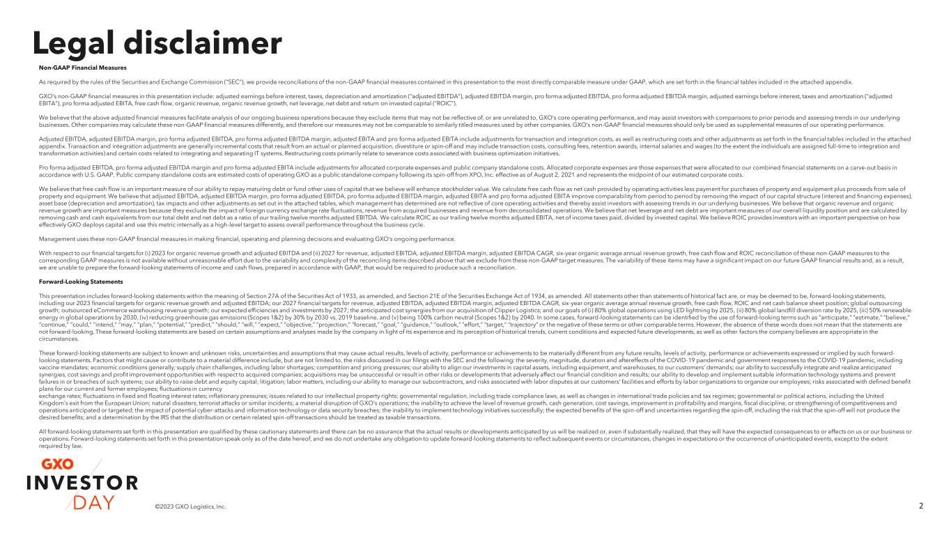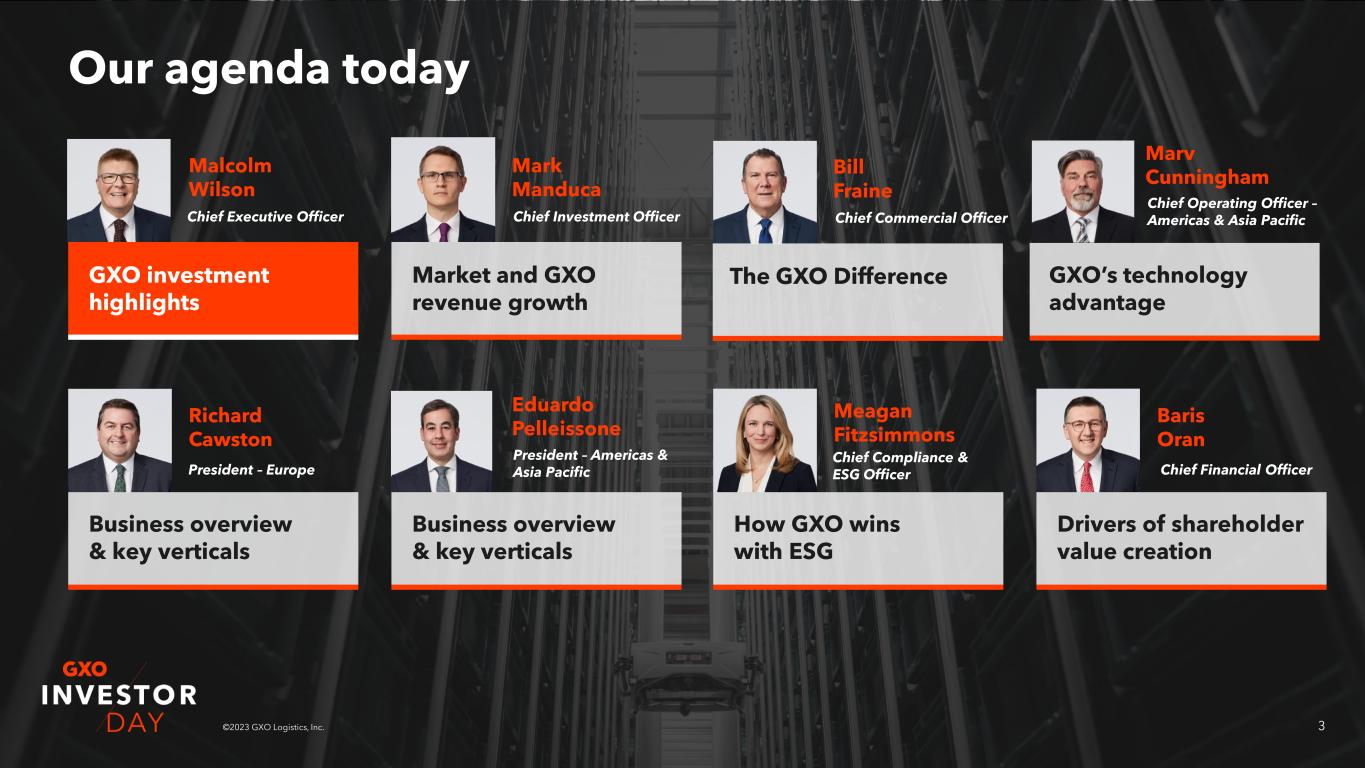 2©2023 GXO Logistics, Inc. Legal disclaimer 2 Non-GAAP Financial Measures As required by the rules of the Securities and Exchange Commission (“SEC”), we provide reconciliations of the non-GAAP financial measures contained in this presentation to the most directly comparable measure under GAAP, which are set forth in the financial tables included in the attached appendix. GXO’s non-GAAP financial measures in this presentation include: adjusted earnings before interest, taxes, depreciation and amortization (“adjusted EBITDA”), adjusted EBITDA margin, pro forma adjusted EBITDA, pro forma adjusted EBITDA margin, adjusted earnings before interest, taxes and amortization (“adjusted EBITA”), pro forma adjusted EBITA, free cash flow, organic revenue, organic revenue growth, net leverage, net debt and return on invested capital (“ROIC”). We believe that the above adjusted financial measures facilitate analysis of our ongoing business operations because they exclude items that may not be reflective of, or are unrelated to, GXO’s core operating performance, and may assist investors with comparisons to prior periods and assessing trends in our underlying businesses. Other companies may calculate these non-GAAP financial measures differently, and therefore our measures may not be comparable to similarly titled measures used by other companies. GXO’s non-GAAP financial measures should only be used as supplemental measures of our operating performance. Adjusted EBITDA, adjusted EBITDA margin, pro forma adjusted EBITDA, pro forma adjusted EBITDA margin, adjusted EBITA and pro forma adjusted EBITA include adjustments for transaction and integration costs, as well as restructuring costs and other adjustments as set forth in the financial tables included in the attached appendix. Transaction and integration adjustments are generally incremental costs that result from an actual or planned acquisition, divestiture or spin-off and may include transaction costs, consulting fees, retention awards, internal salaries and wages (to the extent the individuals are assigned full-time to integration and transformation activities) and certain costs related to integrating and separating IT systems. Restructuring costs primarily relate to severance costs associated with business optimization initiatives. Pro forma adjusted EBITDA, pro forma adjusted EBITDA margin and pro forma adjusted EBITA include adjustments for allocated corporate expenses and public company standalone costs. Allocated corporate expenses are those expenses that were allocated to our combined financial statements on a carve-out basis in accordance with U.S. GAAP. Public company standalone costs are estimated costs of operating GXO as a public standalone company following its spin-off from XPO, Inc. effective as of August 2, 2021 and represents the midpoint of our estimated corporate costs. We believe that free cash flow is an important measure of our ability to repay maturing debt or fund other uses of capital that we believe will enhance stockholder value. We calculate free cash flow as net cash provided by operating activities less payment for purchases of property and equipment plus proceeds from sale of property and equipment. We believe that adjusted EBITDA, adjusted EBITDA margin, pro forma adjusted EBITDA, pro forma adjusted EBITDA margin, adjusted EBITA and pro forma adjusted EBITA improve comparability from period to period by removing the impact of our capital structure (interest and financing expenses), asset base (depreciation and amortization), tax impacts and other adjustments as set out in the attached tables, which management has determined are not reflective of core operating activities and thereby assist investors with assessing trends in our underlying businesses. We believe that organic revenue and organic revenue growth are important measures because they exclude the impact of foreign currency exchange rate fluctuations, revenue from acquired businesses and revenue from deconsolidated operations. We believe that net leverage and net debt are important measures of our overall liquidity position and are calculated by removing cash and cash equivalents from our total debt and net debt as a ratio of our trailing twelve months adjusted EBITDA. We calculate ROIC as our trailing twelve months adjusted EBITA, net of income taxes paid, divided by invested capital. We believe ROIC provides investors with an important perspective on how effectively GXO deploys capital and use this metric internally as a high-level target to assess overall performance throughout the business cycle. Management uses these non-GAAP financial measures in making financial, operating and planning decisions and evaluating GXO’s ongoing performance. With respect to our financial targets for (i) 2023 for organic revenue growth and adjusted EBITDA and (ii) 2027 for revenue, adjusted EBITDA, adjusted EBITDA margin, adjusted EBITDA CAGR, six-year organic average annual revenue growth, free cash flow and ROIC reconciliation of these non-GAAP measures to the corresponding GAAP measures is not available without unreasonable effort due to the variability and complexity of the reconciling items described above that we exclude from these non-GAAP target measures. The variability of these items may have a significant impact on our future GAAP financial results and, as a result, we are unable to prepare the forward-looking statements of income and cash flows, prepared in accordance with GAAP, that would be required to produce such a reconciliation. Forward-Looking Statements This presentation includes forward-looking statements within the meaning of Section 27A of the Securities Act of 1933, as amended, and Section 21E of the Securities Exchange Act of 1934, as amended. All statements other than statements of historical fact are, or may be deemed to be, forward-looking statements, including our 2023 financial targets for organic revenue growth and adjust