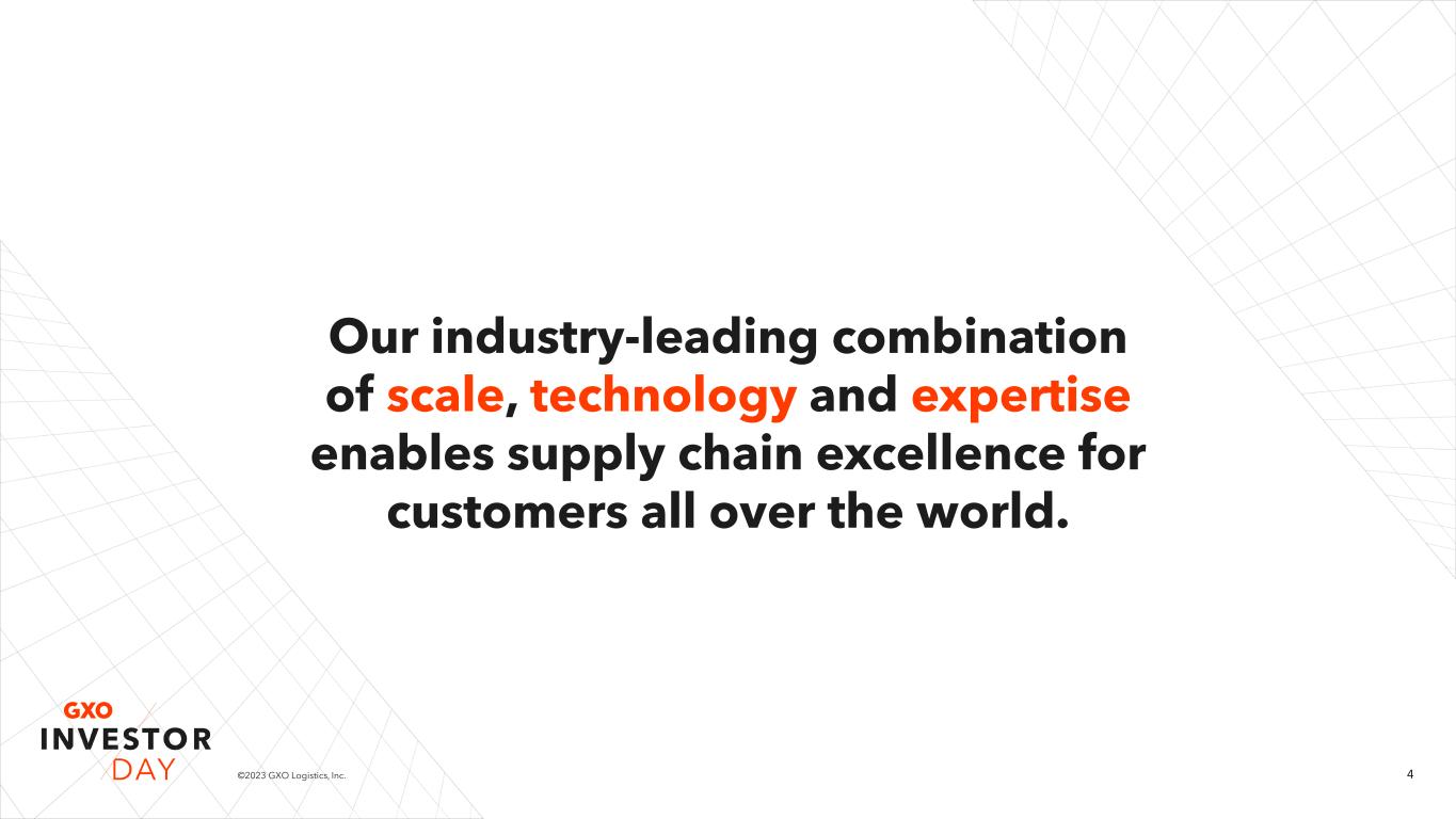 3©2023 GXO Logistics, Inc. Our agenda today Malcolm Wilson Market and GXO revenue growth Mark Manduca The GXO Difference Bill Fraine Business overview & key verticals Richard Cawston Business overview & key verticals Eduardo Pelleissone How GXO wins with ESG Meagan Fitzsimmons Drivers of shareholder value creation Baris Oran Chief Executive Officer Chief Investment Officer Chief Commercial Officer President – Europe President – Americas & Asia Pacific Chief Compliance & ESG Officer Chief Financial Officer GXO’s technology advantage Marv Cunningham Chief Operating Officer – Americas & Asia Pacific GXO investment highlights