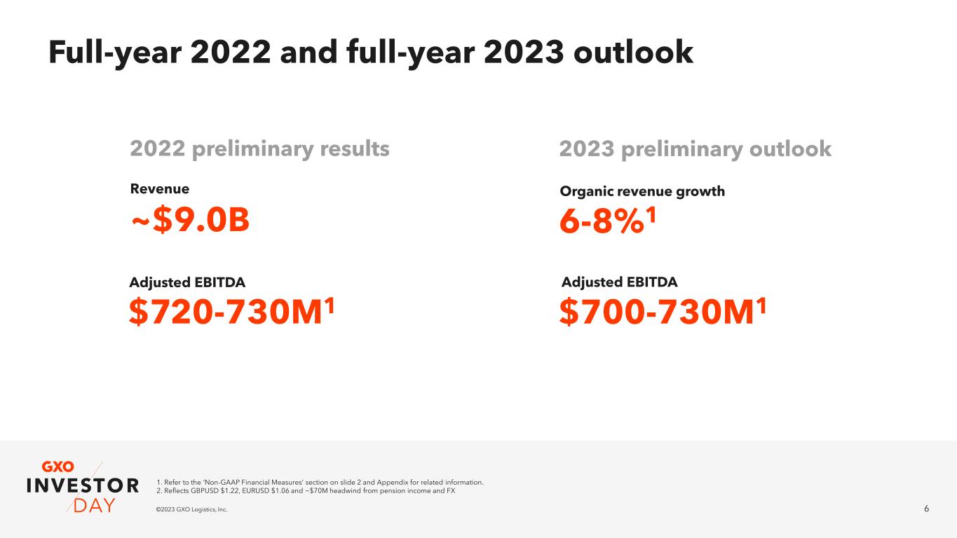 5©2023 GXO Logistics, Inc. GXO at a glance Countries of operation 27 Warehouse locations 974 Total warehouse space (sq. ft.) ~200M Global customers >1,200 Global team members ~130K 2021 Revenue $8B 2017-2021 Organic revenue CAGR 8%1 2021 Pro forma adjusted EBITDA $633M1 2021 FCF conversion >30%1 2021 Operating return on invested capital >30%1 1. Refer to the ‘Non-GAAP Financial Measures’ section on slide 2 and Appendix for related information.