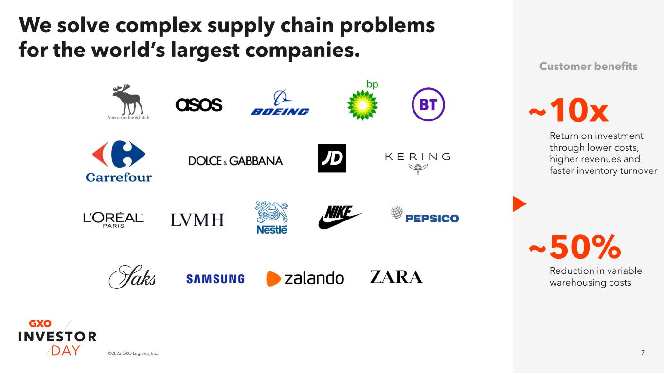 6©2023 GXO Logistics, Inc. Full-year 2022 and full-year 2023 outlook 2022 preliminary results 2023 preliminary outlook Revenue ~$9.0B Organic revenue growth 6-8%1 $720-730M1 Adjusted EBITDA $700-730M1 Adjusted EBITDA 1. Refer to the ‘Non-GAAP Financial Measures’ section on slide 2 and Appendix for related information. 2. Reflects GBPUSD $1.22, EURUSD $1.06 and ~$70M headwind from pension income and FX