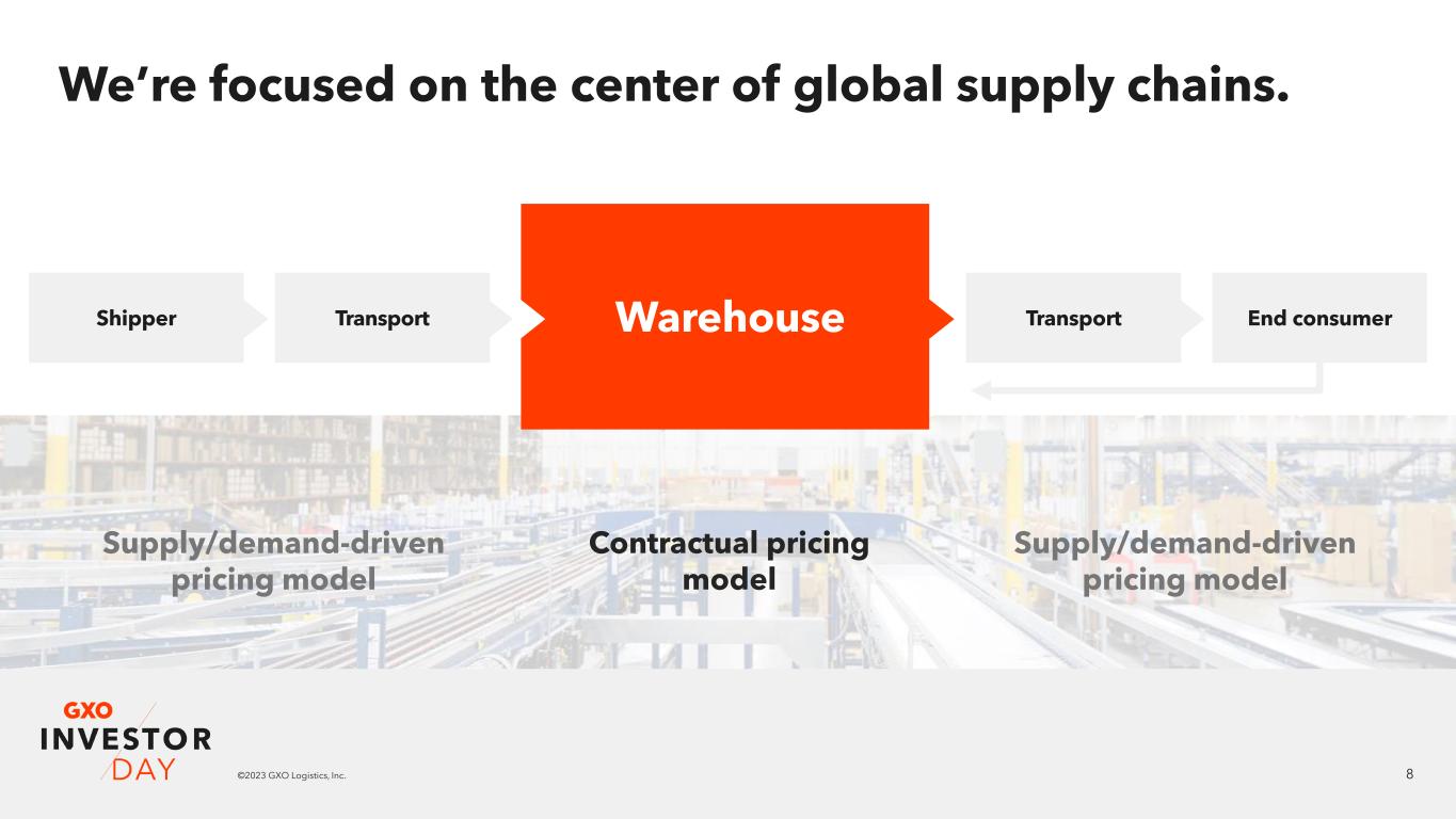 7©2023 GXO Logistics, Inc. We solve complex supply chain problems for the world’s largest companies. ~10x Return on investment through lower costs, higher revenues and faster inventory turnover ~50% Reduction in variable warehousing costs Customer benefits