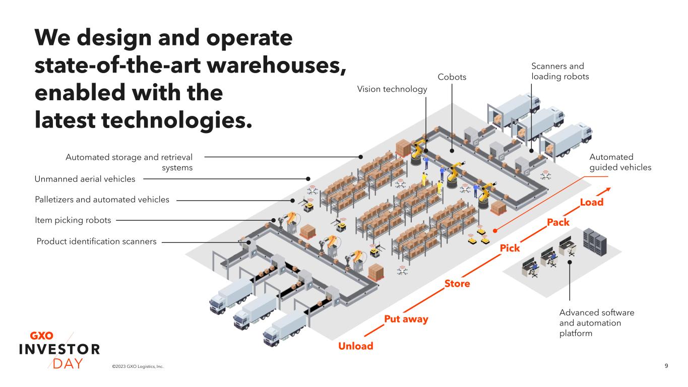 8©2023 GXO Logistics, Inc. We’re focused on the center of global supply chains. Contractual pricing model Warehouse Transport End consumerTransportShipper Supply/demand-driven pricing model Supply/demand-driven pricing model