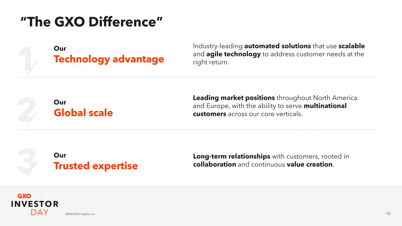 11©2023 GXO Logistics, Inc. A massive and rapidly growing market opportunity 2021 2027 TAM $456 billion1 TAM $660 billion1 $146 billion1 Outsourced market $231 billion1 Outsourced market $8 billion GXO Revenue ~$17 billion Anticipated GXO Revenue +45% +58% +115% 32% outsourced 35% outsourced GXO market share gain of outsourced market ~200bps 1. Based upon third-party research