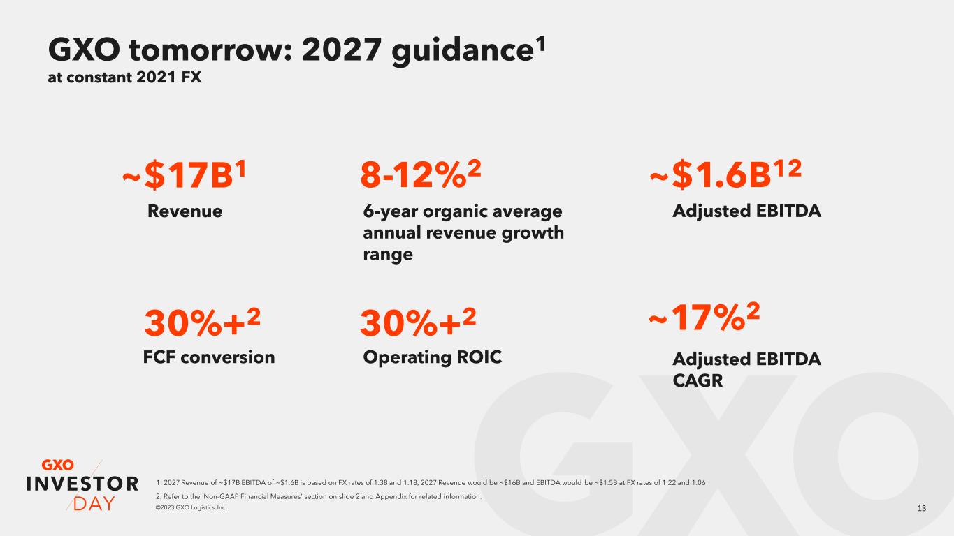 12©2023 GXO Logistics, Inc. “The GXO Difference” Industry-leading automated solutions that use scalable and agile technology to address customer needs at the right return. Leading market positions throughout North America and Europe, with the ability to serve multinational customers across our core verticals. Long-term relationships with customers, rooted in collaboration and continuous value creation. Our Global scale Our Trusted expertise Our Technology advantage1 2 3