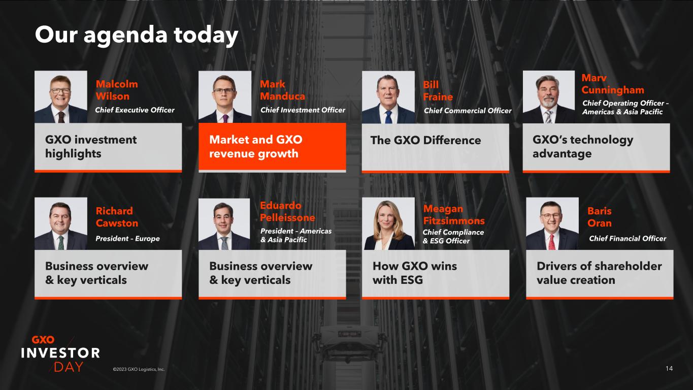 13©2023 GXO Logistics, Inc. GXO tomorrow: 2027 guidance1 at constant 2021 FX 1. 2027 Revenue of ~$17B EBITDA of ~$1.6B is based on FX rates of 1.38 and 1.18, 2027 Revenue would be ~$16B and EBITDA would be ~$1.5B at FX rates of 1.22 and 1.06 Revenue ~$17B1 6-year organic average annual revenue growth range 8-12%2 Adjusted EBITDA ~$1.6B12 FCF conversion 30%+2 Operating ROIC 30%+2 Adjusted EBITDA CAGR ~17%2 2. Refer to the ‘Non-GAAP Financial Measures’ section on slide 2 and Appendix for related information.