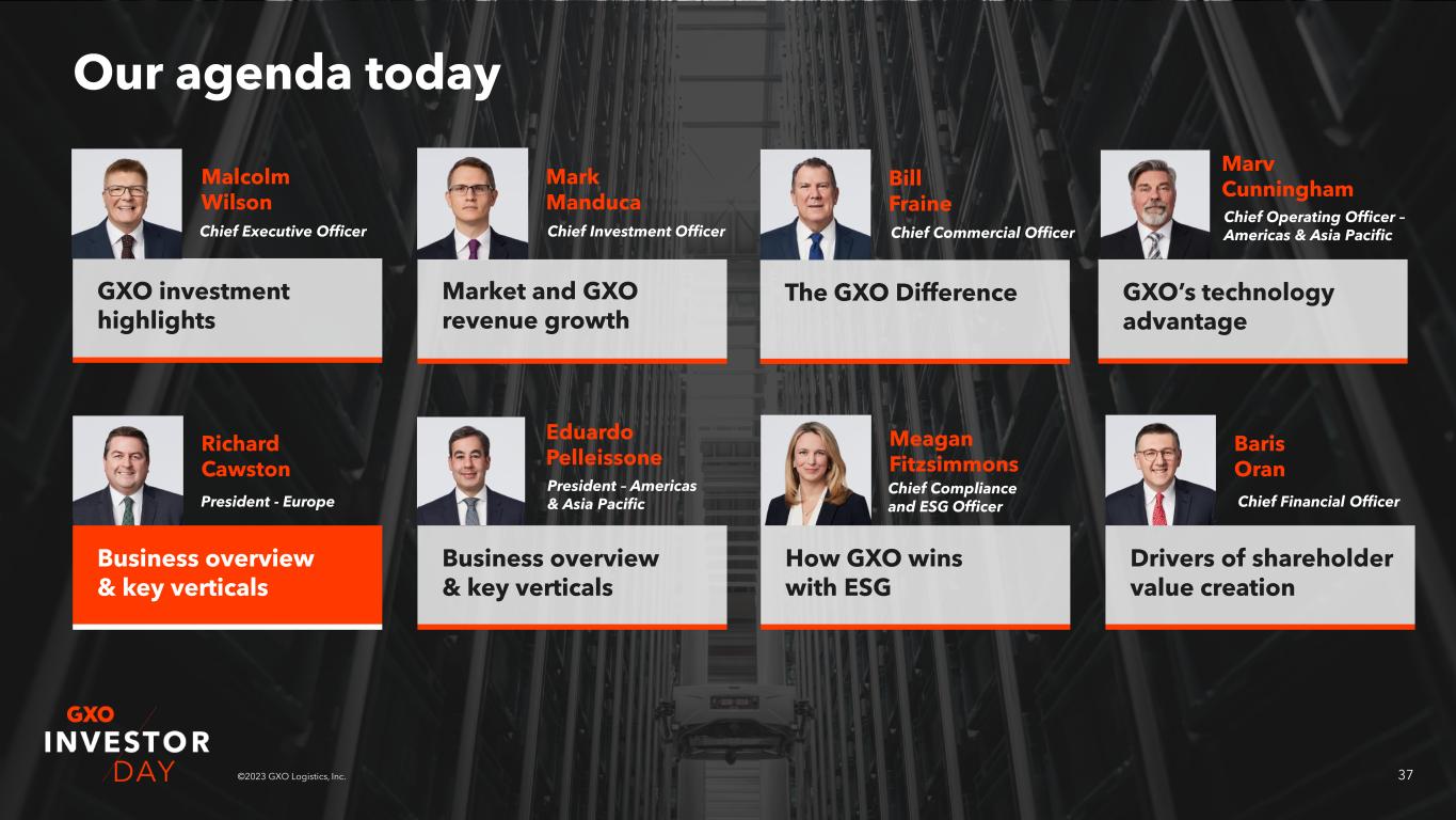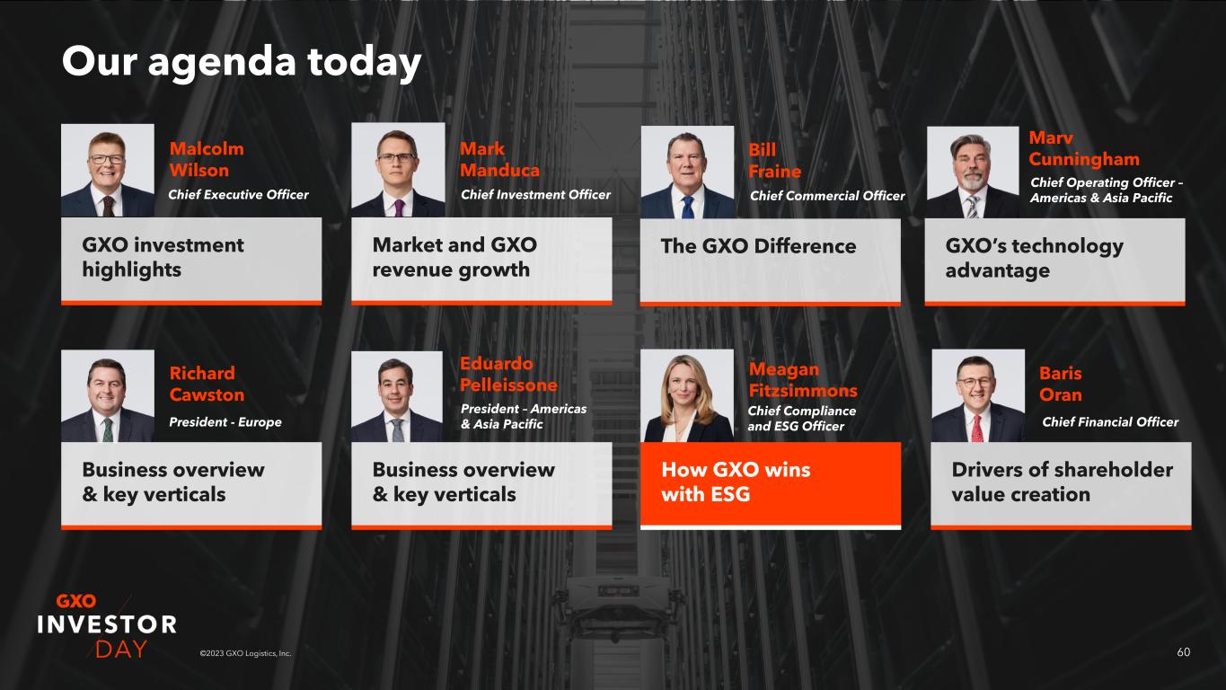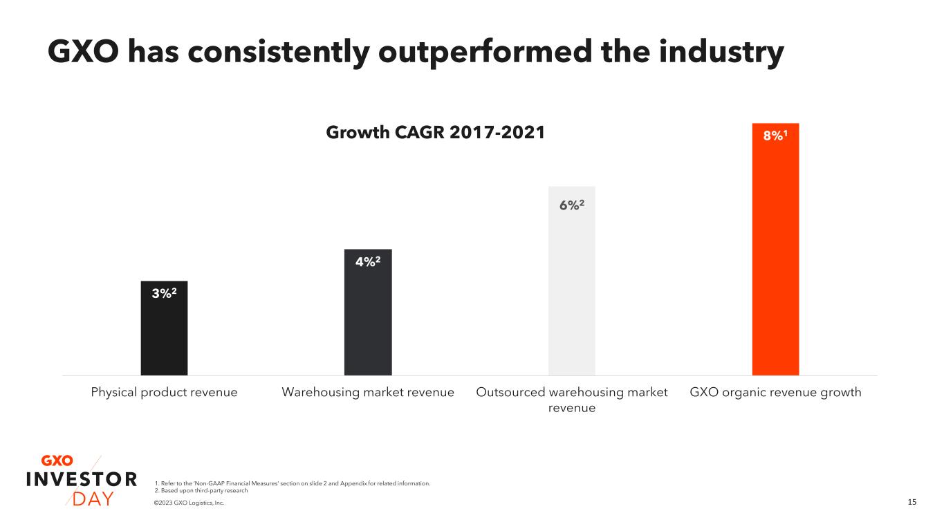 14©2023 GXO Logistics, Inc. Our agenda today GXO investment highlights Malcolm Wilson Market and GXO revenue growth Mark Manduca The GXO Difference Bill Fraine Business overview & key verticals Richard Cawston Business overview & key verticals Eduardo Pelleissone How GXO wins with ESG Meagan Fitzsimmons Drivers of shareholder value creation Baris Oran Chief Executive Officer Chief Investment Officer Chief Commercial Officer President – Europe President – Americas & Asia Pacific Chief Compliance & ESG Officer Chief Financial Officer GXO’s technology advantage Marv Cunningham Chief Operating Officer – Americas & Asia Pacific