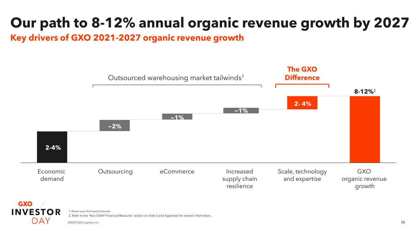 15©2023 GXO Logistics, Inc. GXO has consistently outperformed the industry 3%2 4%2 6%2 8%1 Physical product revenue Warehousing market revenue Outsourced warehousing market revenue GXO organic revenue growth Growth CAGR 2017-2021 1. Refer to the ‘Non-GAAP Financial Measures’ section on slide 2 and Appendix for related information. 2. Based upon third-party research
