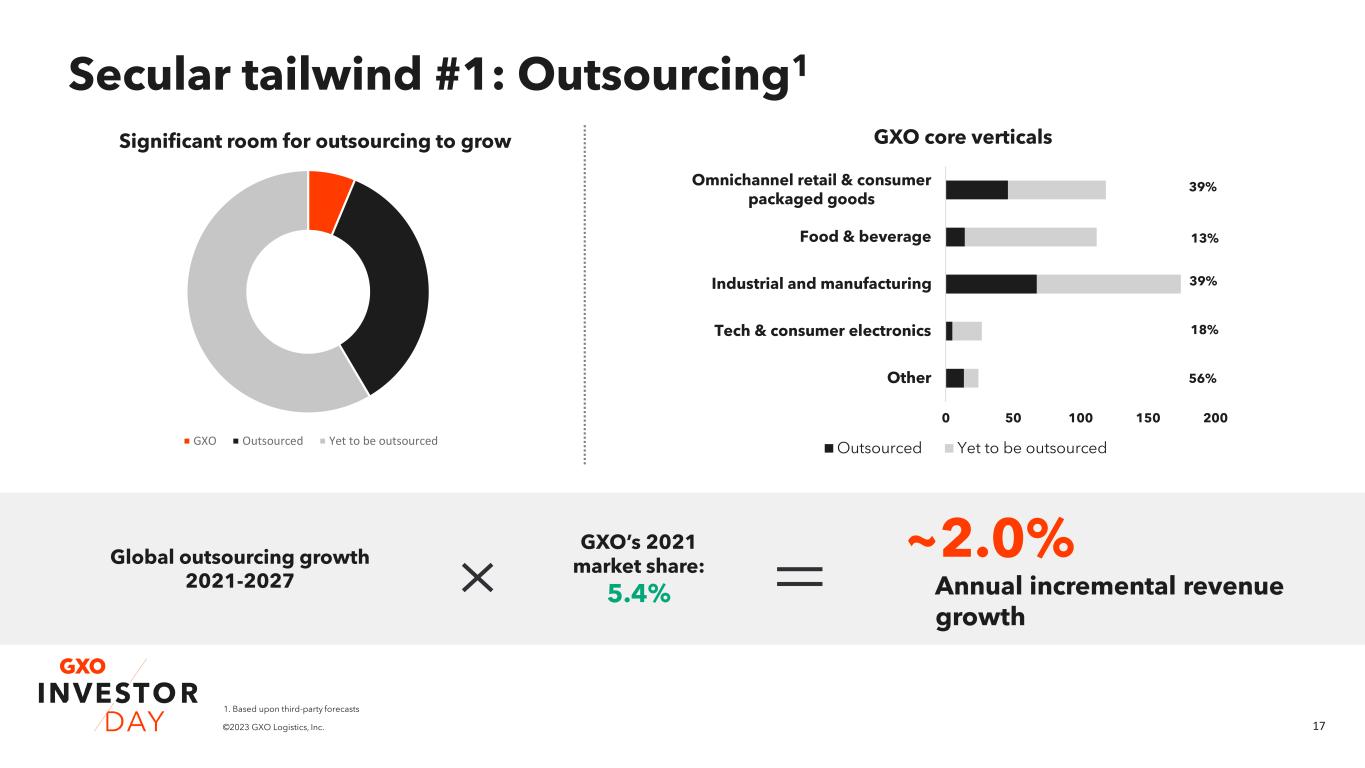 16©2023 GXO Logistics, Inc. 2-4% Increased supply chain resilience Economic demand ~2% Outsourcing ~1% eCommerce ~1% 2- 4% Scale, technology and expertise GXO organic revenue growth 8-12%2 Our path to 8-12% annual organic revenue growth by 2027 Key drivers of GXO 2021-2027 organic revenue growth The GXO DifferenceOutsourced warehousing market tailwinds1 1. Based upon third-party forecasts 2. Refer to the ‘Non-GAAP Financial Measures’ section on slide 2 and Appendix for related information.