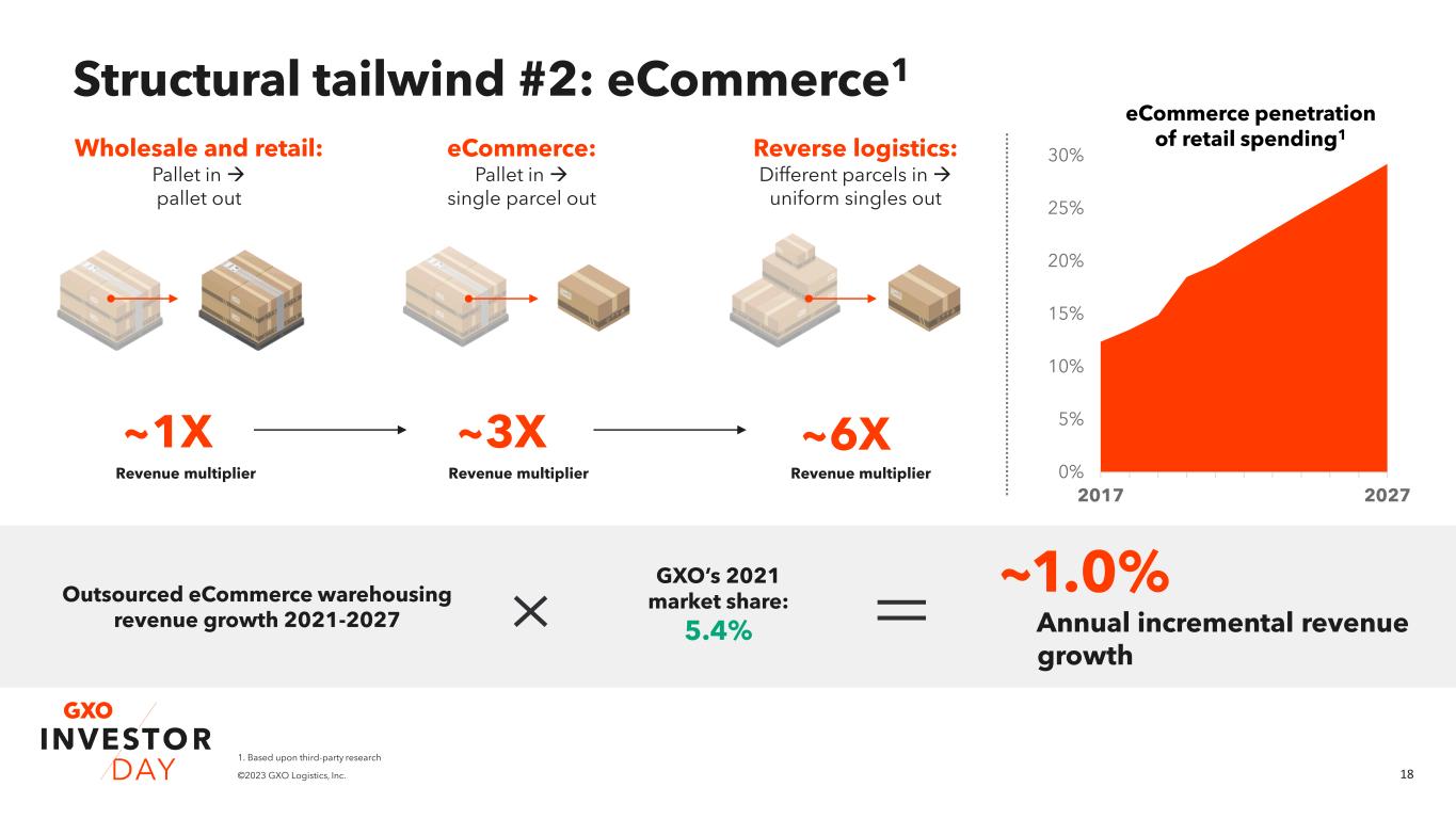 17©2023 GXO Logistics, Inc. GXO Outsourced Yet to be outsourced Secular tailwind #1: Outsourcing1 Global outsourcing growth 2021-2027 GXO’s 2021 market share: 5.4% ~2.0% Annual incremental revenue growth Significant room for outsourcing to grow 1. Based upon third-party forecasts 56% 18% 39% 13% 39% 0 50 100 150 200 Other Tech & consumer electronics Industrial and manufacturing Food & beverage Omnichannel retail & consumer packaged goods GXO core verticals Outsourced Yet to be outsourced