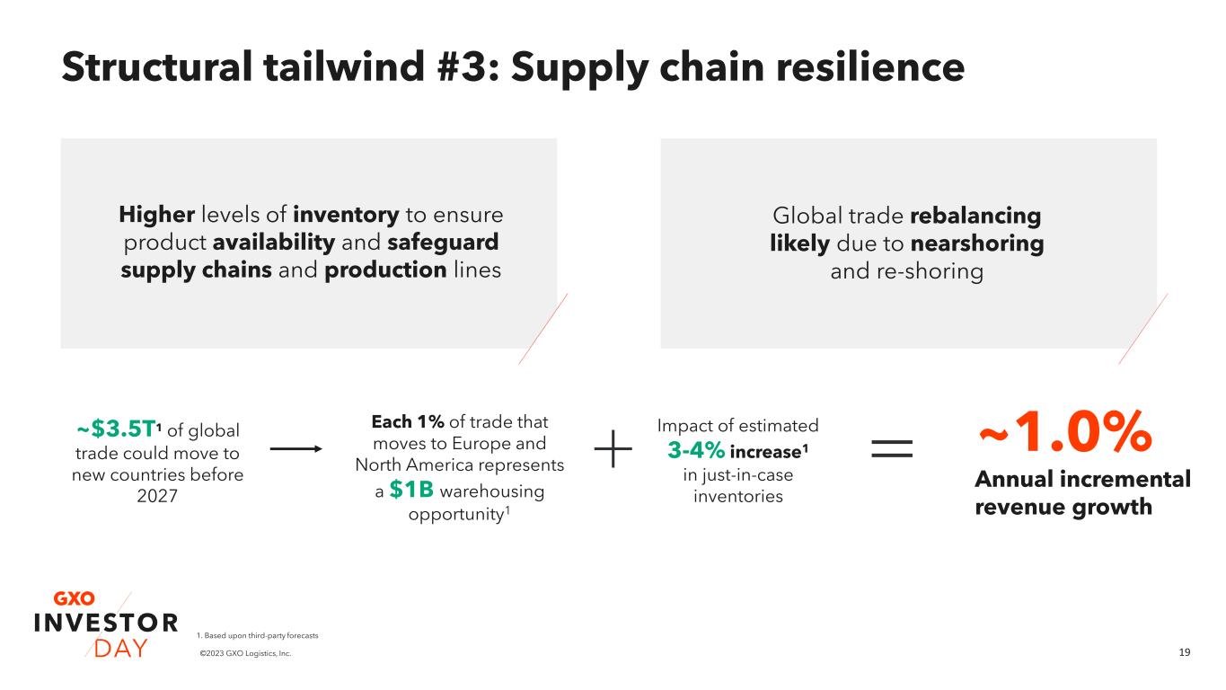 18©2023 GXO Logistics, Inc. Structural tailwind #2: eCommerce1 0% 5% 10% 15% 20% 25% 30% 2017 2027 ~3X ~6X eCommerce penetration of retail spending1 ~1X Revenue multiplier Outsourced eCommerce warehousing revenue growth 2021-2027 GXO’s 2021 market share: 5.4% ~1.0% Annual incremental revenue growth Wholesale and retail: Pallet in → pallet out eCommerce: Pallet in → single parcel out Reverse logistics: Different parcels in → uniform singles out Revenue multiplier Revenue multiplier 1. Based upon third-party research