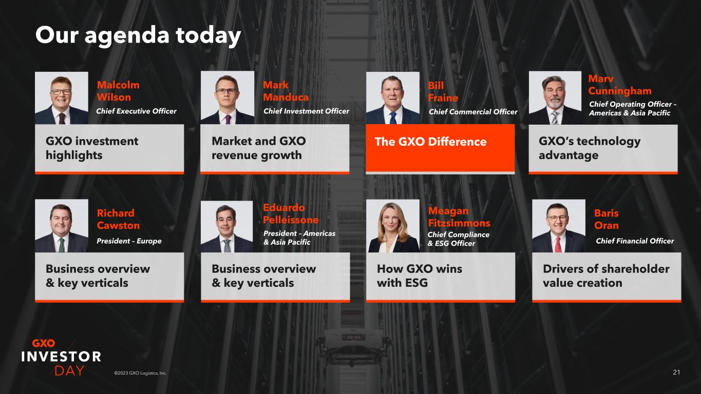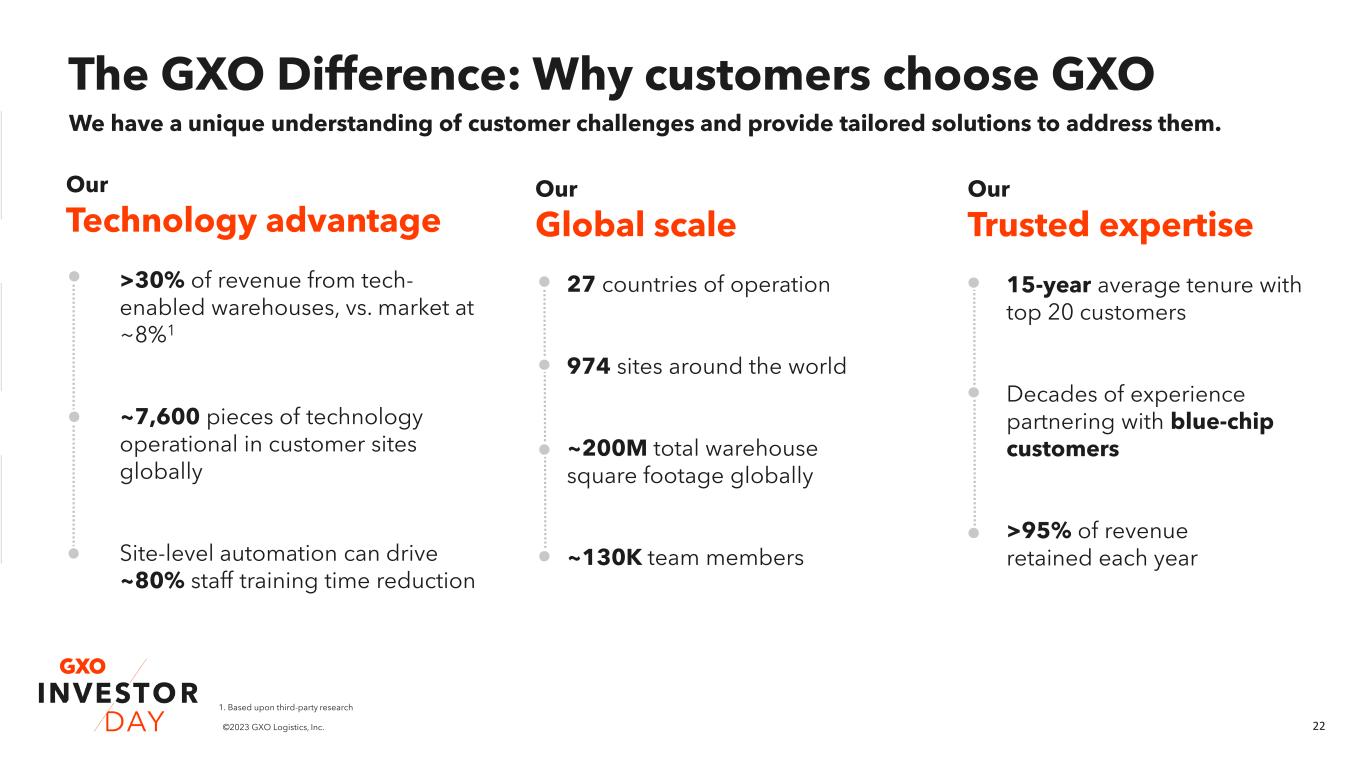 21©2023 GXO Logistics, Inc. Our agenda today GXO investment highlights Malcolm Wilson Market and GXO revenue growth Mark Manduca The GXO Difference Bill Fraine Business overview & key verticals Richard Cawston Business overview & key verticals Eduardo Pelleissone How GXO wins with ESG Meagan Fitzsimmons Drivers of shareholder value creation Baris Oran Chief Executive Officer Chief Investment Officer Chief Commercial Officer President – Europe President – Americas & Asia Pacific Chief Compliance & ESG Officer Chief Financial Officer GXO’s technology advantage Marv Cunningham Chief Operating Officer – Americas & Asia Pacific
