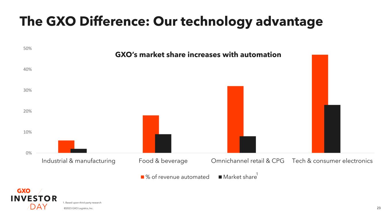 22©2023 GXO Logistics, Inc. The GXO Difference: Why customers choose GXO We have a unique understanding of customer challenges and provide tailored solutions to address them. 27 countries of operation 974 sites around the world ~200M total warehouse square footage globally ~130K team members >30% of revenue from tech- enabled warehouses, vs. market at ~8%1 ~7,600 pieces of technology operational in customer sites globally Site-level automation can drive ~80% staff training time reduction 15-year average tenure with top 20 customers Decades of experience partnering with blue-chip customers >95% of revenue retained each year Our Global scale Our Trusted expertise Our Technology advantage 1. Based upon third-party research