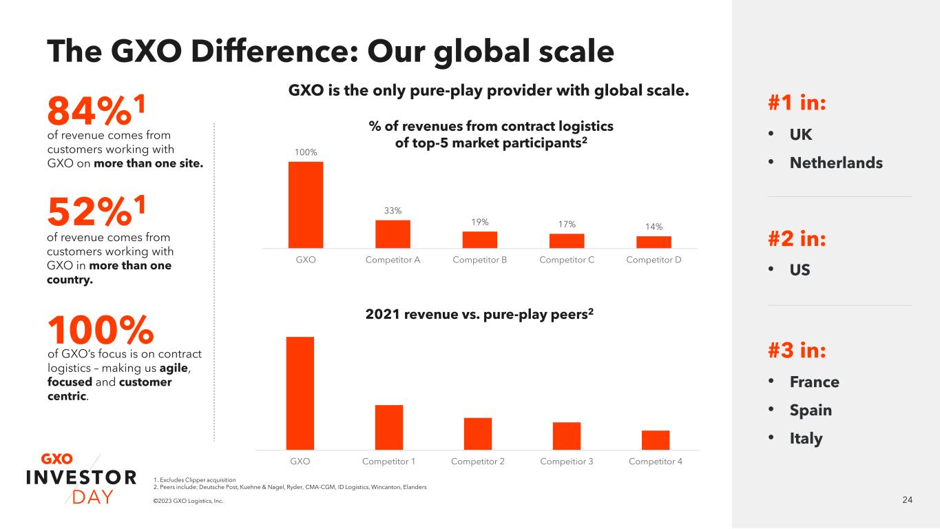 23©2023 GXO Logistics, Inc. The GXO Difference: Our technology advantage GXO’s market share increases with automation 0% 10% 20% 30% 40% 50% Industrial & manufacturing Food & beverage Omnichannel retail & CPG Tech & consumer electronics % of revenue automated Market share 1. Based upon third-party research 1