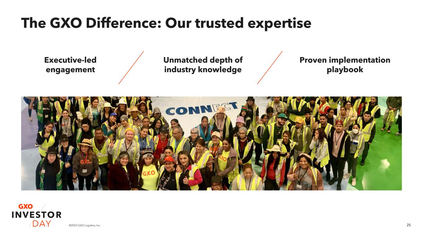 24©2023 GXO Logistics, Inc. • UK • Netherlands #1 in: • US #2 in: • France • Spain • Italy #3 in: 100% 33% 19% 17% 14% GXO Competitor A Competitor B Competitor C Competitor D % of revenues from contract logistics of top-5 market participants2 84%1 of revenue comes from customers working with GXO on more than one site. 52%1 of GXO’s focus is on contract logistics – making us agile, focused and customer centric. The GXO Difference: Our global scale GXO is the only pure-play provider with global scale. 100% of revenue comes from customers working with GXO in more than one country. GXO Competitor 1 Competitor 2 Compeitior 3 Competitor 4 2021 revenue vs. pure-play peers2 1. Excludes Clipper acquisition 2. Peers include: Deutsche Post, Kuehne & Nagel, Ryder, CMA-CGM, ID Logistics, Wincanton, Elanders