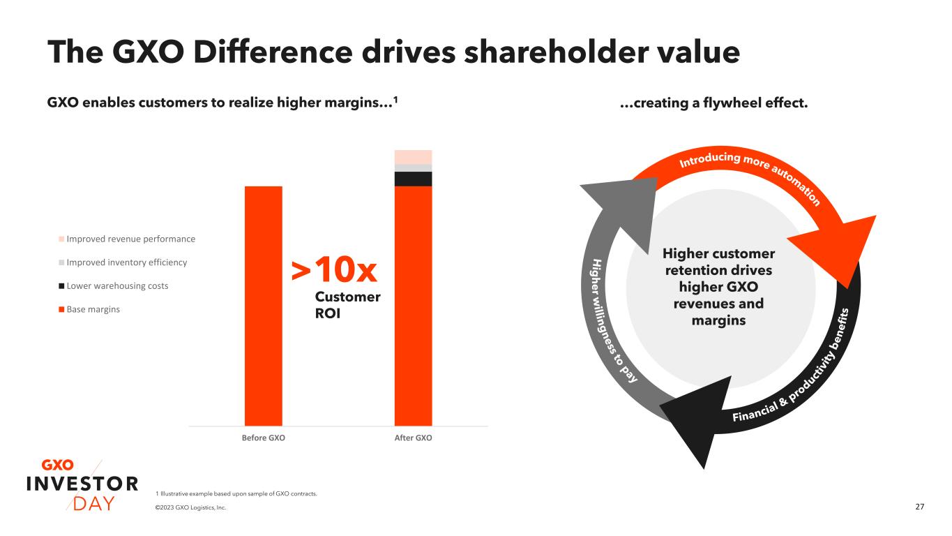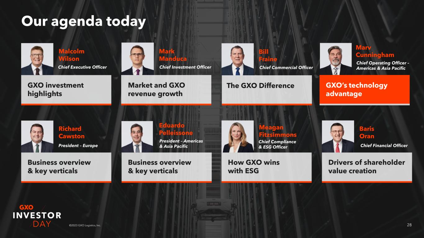27©2023 GXO Logistics, Inc. Before GXO After GXO Improved revenue performance Improved inventory efficiency Lower warehousing costs Base margins The GXO Difference drives shareholder value Higher customer retention drives higher GXO revenues and margins >10x Customer ROI GXO enables customers to realize higher margins…1 …creating a flywheel effect. 1 Illustrative example based upon sample of GXO contracts.