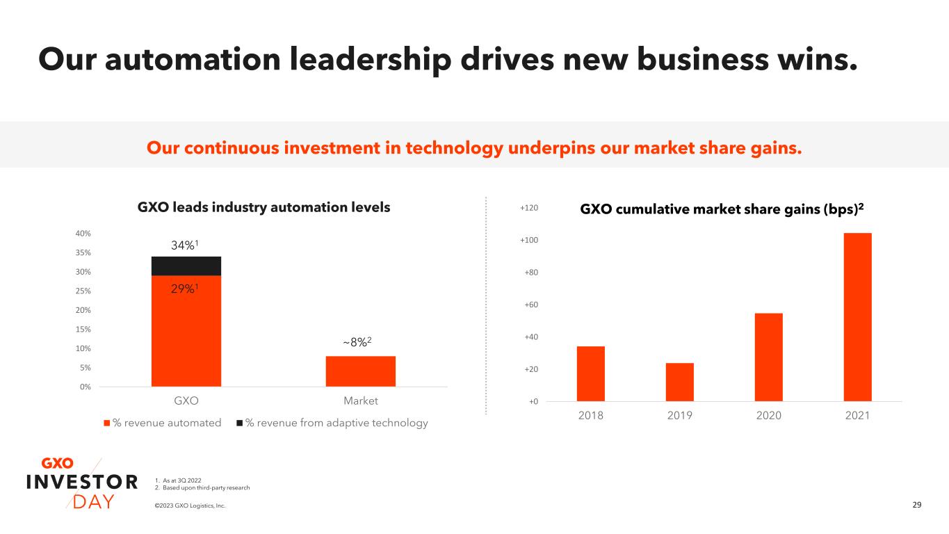 28©2023 GXO Logistics, Inc. Our agenda today GXO investment highlights Malcolm Wilson Market and GXO revenue growth Mark Manduca The GXO Difference Bill Fraine Business overview & key verticals Richard Cawston Business overview & key verticals Eduardo Pelleissone How GXO wins with ESG Meagan Fitzsimmons Drivers of shareholder value creation Baris Oran Chief Executive Officer Chief Investment Officer Chief Commercial Officer President – Europe President – Americas & Asia Pacific Chief Compliance & ESG Officer Chief Financial Officer Marv Cunningham Chief Operating Officer – Americas & Asia Pacific GXO’s technology advantage