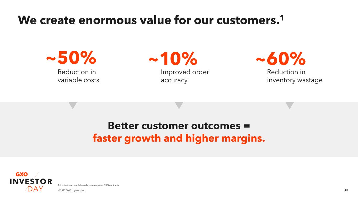 29©2023 GXO Logistics, Inc. Our automation leadership drives new business wins. 1. As at 3Q 2022 2. Based upon third-party research +0 +20 +40 +60 +80 +100 +120 2018 2019 2020 2021 GXO cumulative market share gains (bps)2 Our continuous investment in technology underpins our market share gains. 0% 5% 10% 15% 20% 25% 30% 35% 40% GXO Market GXO leads industry automation levels % revenue automated % revenue from adaptive technology 34%1 ~8%2 29%1