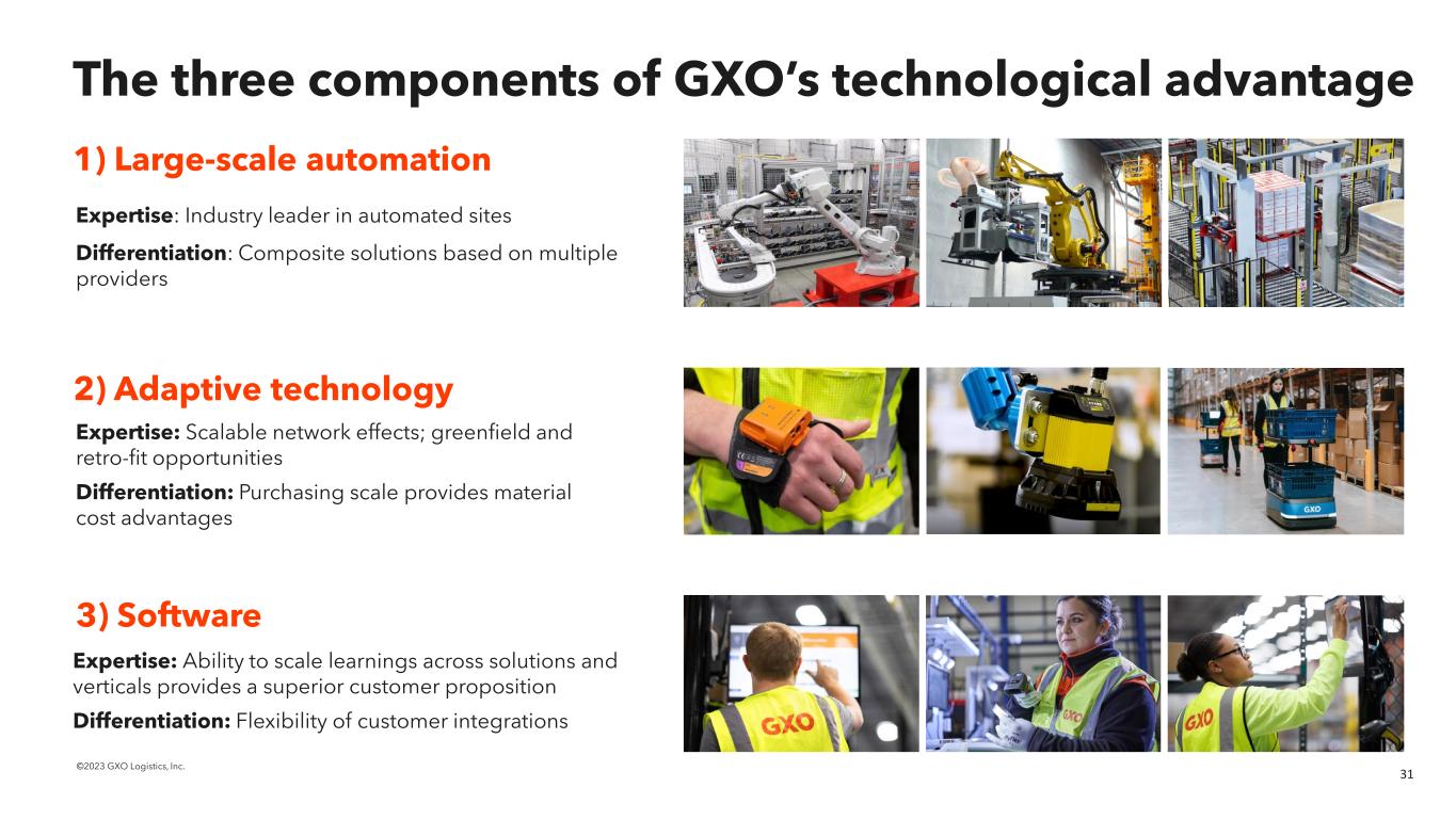 30©2023 GXO Logistics, Inc. We create enormous value for our customers.1 ~50% Reduction in variable costs ~60% Reduction in inventory wastage Better customer outcomes = faster growth and higher margins. ~10% Improved order accuracy 1. Illustrative example based upon sample of GXO contracts.