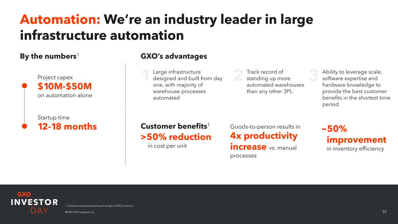 31©2023 GXO Logistics, Inc. The three components of GXO’s technological advantage 3) Software 1) Large-scale automation Expertise: Industry leader in automated sites Differentiation: Composite solutions based on multiple providers 2) Adaptive technology Expertise: Scalable network effects; greenfield and retro-fit opportunities Differentiation: Purchasing scale provides material cost advantages Expertise: Ability to scale learnings across solutions and verticals provides a superior customer proposition Differentiation: Flexibility of customer integrations ©2023 GXO Logistics, Inc.
