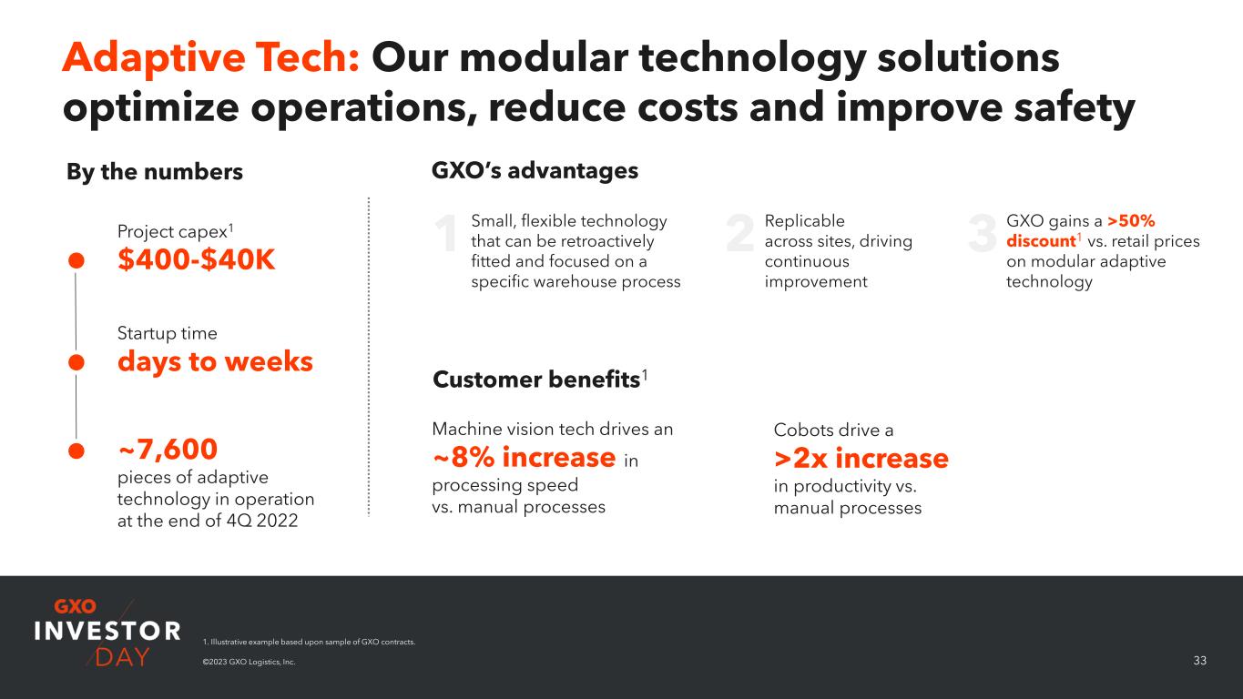 32©2023 GXO Logistics, Inc. Automation: We’re an industry leader in large infrastructure automation Large infrastructure designed and built from day one, with majority of warehouse processes automated Project capex $10M-$50M on automation alone Startup time 12-18 months >50% reduction in cost per unit Goods-to-person results in 4x productivity increase vs. manual processes GXO’s advantages Customer benefits1 By the numbers1 Track record of standing up more automated warehouses than any other 3PL Ability to leverage scale, software expertise and hardware knowledge to provide the best customer benefits in the shortest time period 1 2 3 1. Illustrative example based upon sample of GXO contracts. ~50% improvement in inventory efficiency