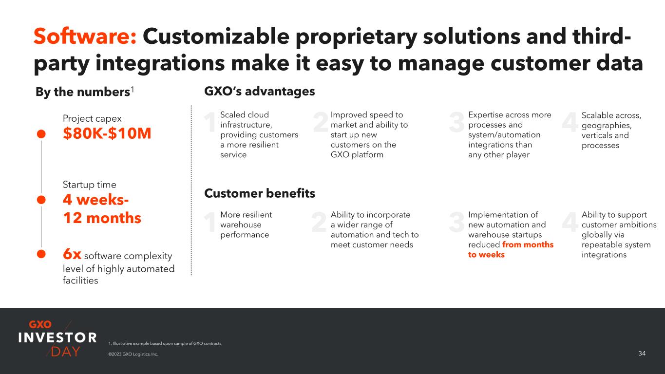 33©2023 GXO Logistics, Inc. Adaptive Tech: Our modular technology solutions optimize operations, reduce costs and improve safety Small, flexible technology that can be retroactively fitted and focused on a specific warehouse process Project capex1 $400-$40K Startup time days to weeks ~7,600 pieces of adaptive technology in operation at the end of 4Q 2022 GXO’s advantages Customer benefits1 By the numbers Replicable across sites, driving continuous improvement GXO gains a >50% discount1 vs. retail prices on modular adaptive technology 1 2 3 Cobots drive a >2x increase in productivity vs. manual processes Machine vision tech drives an ~8% increase in processing speed vs. manual processes 1. Illustrative example based upon sample of GXO contracts.