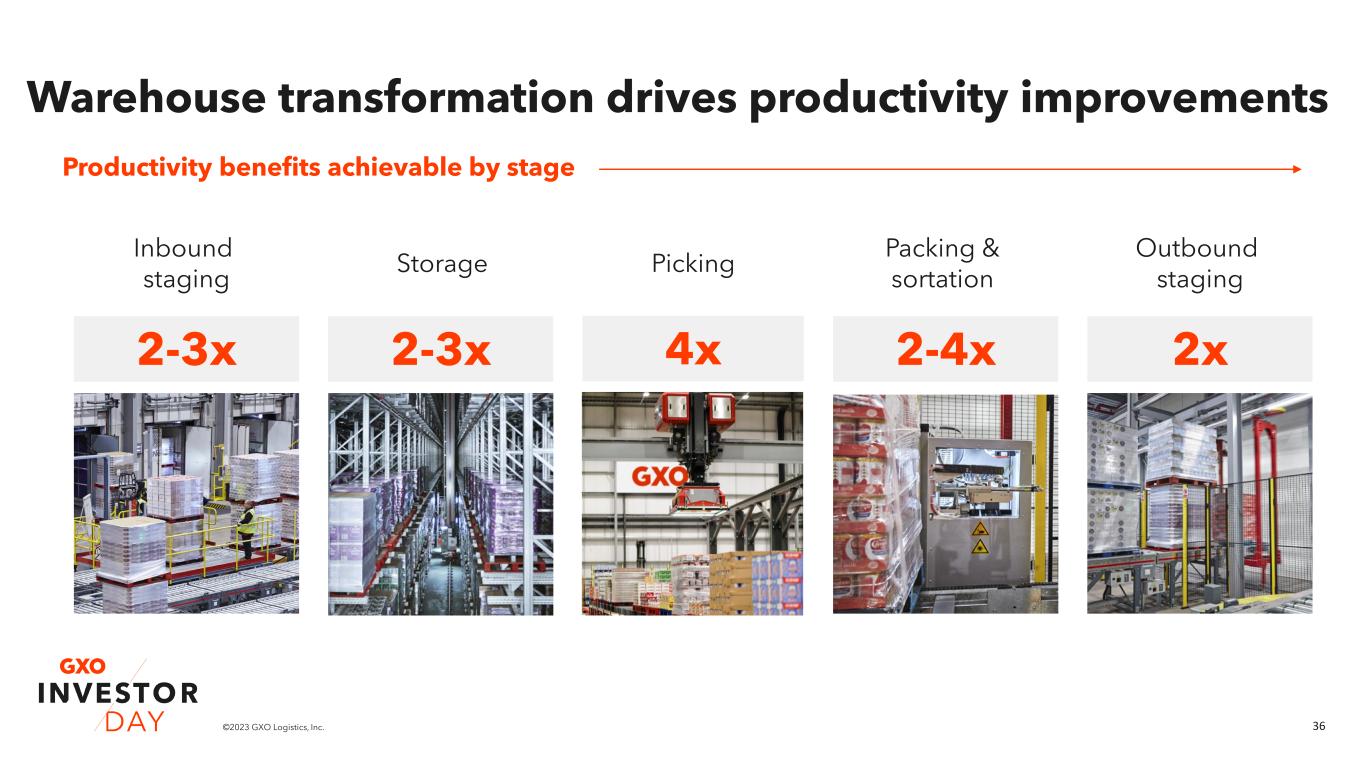 36©2023 GXO Logistics, Inc. Warehouse transformation drives productivity improvements Storage Inbound staging Picking Packing & sortation Outbound staging 2-3x Productivity benefits achievable by stage 4x 2-3x 2-4x 2x