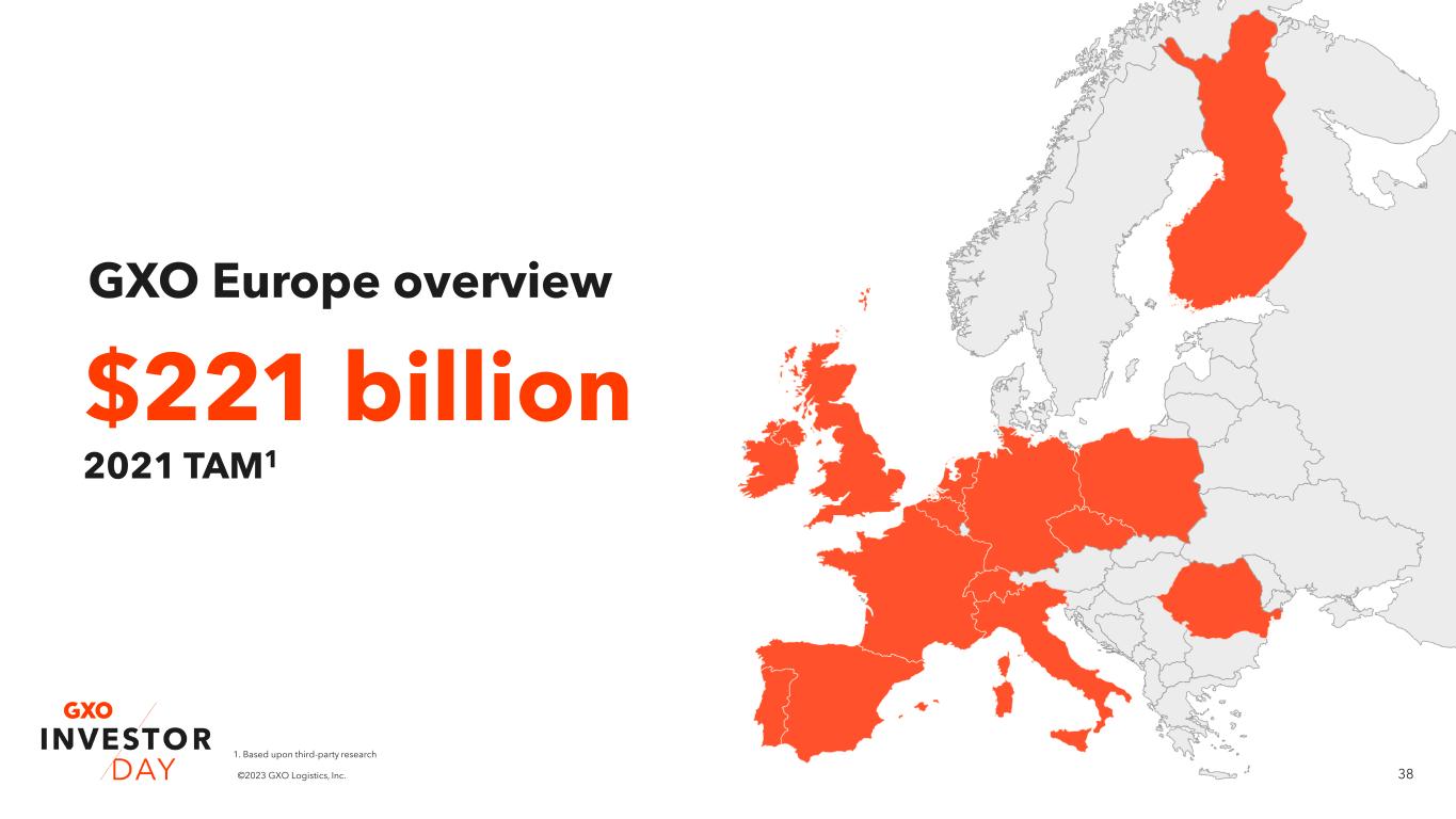 37©2023 GXO Logistics, Inc. Our agenda today GXO investment highlights Malcolm Wilson Market and GXO revenue growth Mark Manduca Richard Cawston Eduardo Pelleissone Meagan Fitzsimmons Baris Oran Chief Executive Officer Chief Investment Officer President - Europe President – Americas & Asia Pacific Chief Compliance and ESG Officer Chief Financial Officer The GXO Difference Bill Fraine Chief Commercial Officer GXO’s technology advantage Marv Cunningham Chief Operating Officer – Americas & Asia Pacific How GXO wins with ESG Drivers of shareholder value creation Business overview & key verticals Business overview & key verticals
