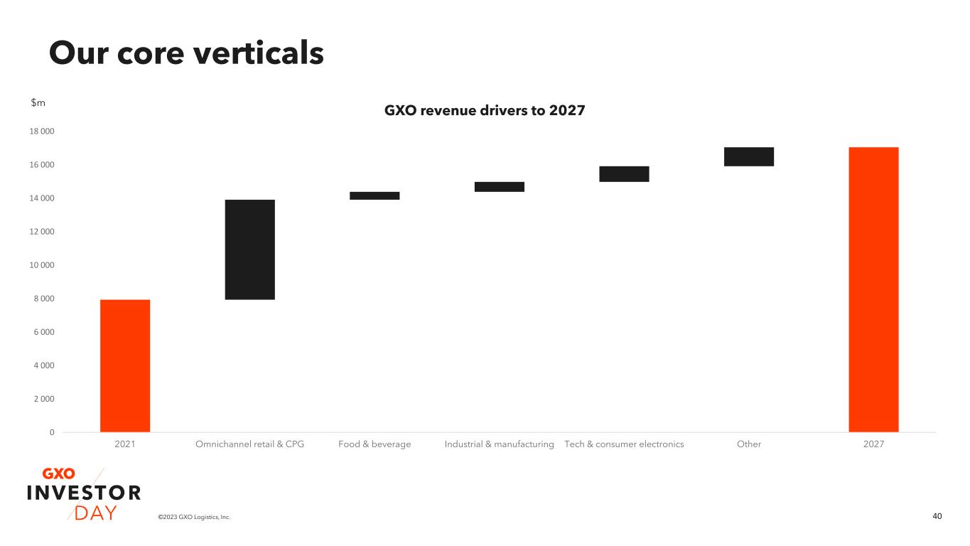 39©2023 GXO Logistics, Inc. Our core verticals 0 2 000 4 000 6 000 8 000 10 000 12 000 14 000 16 000 18 000 2021 Omnichannel retail & CPG Food & beverage Industrial & manufacturing Tech & consumer electronics Other 2027 GXO revenue drivers to 2027 $m