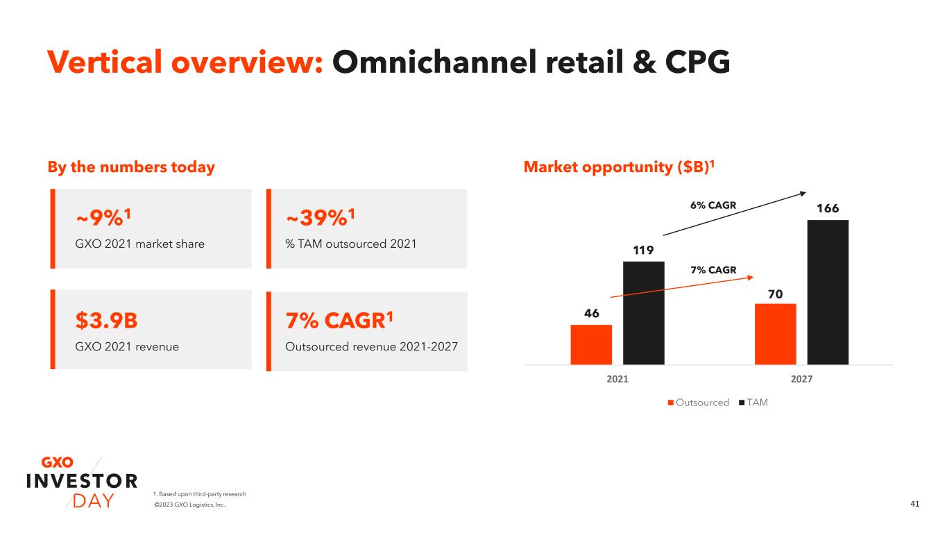 40©2023 GXO Logistics, Inc. Our core verticals 0 2 000 4 000 6 000 8 000 10 000 12 000 14 000 16 000 18 000 2021 Omnichannel retail & CPG Food & beverage Industrial & manufacturing Tech & consumer electronics Other 2027 GXO revenue drivers to 2027 $m