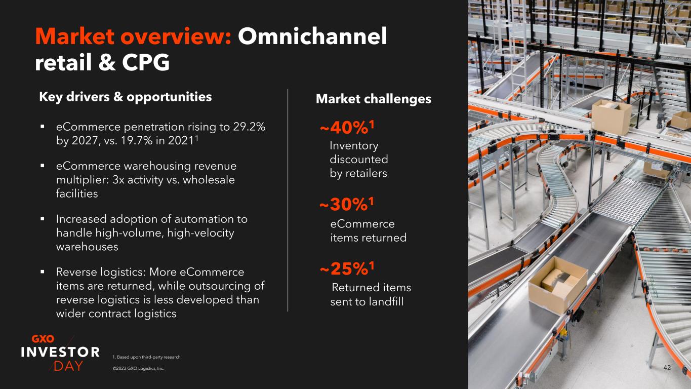 41©2023 GXO Logistics, Inc. 2021 2027 Outsourced TAM Vertical overview: Omnichannel retail & CPG ~9%1 GXO 2021 market share ~39%1 % TAM outsourced 2021 By the numbers today Market opportunity ($B)1 46 119 70 1666% CAGR 7% CAGR $3.9B GXO 2021 revenue 7% CAGR1 Outsourced revenue 2021-2027 1. Based upon third-party research