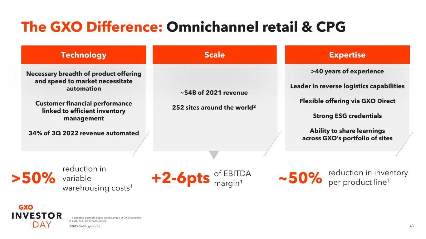 43©2023 GXO Logistics, Inc. The GXO Difference: Omnichannel retail & CPG Technology Scale Expertise >50% reduction in variable warehousing costs1 +2-6pts of EBITDA margin1 ~50% reduction in inventory per product line1 Necessary breadth of product offering and speed to market necessitate automation Customer financial performance linked to efficient inventory management 34% of 3Q 2022 revenue automated ~$4B of 2021 revenue 252 sites around the world2 >40 years of experience Leader in reverse logistics capabilities Flexible offering via GXO Direct Strong ESG credentials Ability to share learnings across GXO’s portfolio of sites 1. Illustrative example based upon sample of GXO contracts. 2. Excludes Clipper acquisition