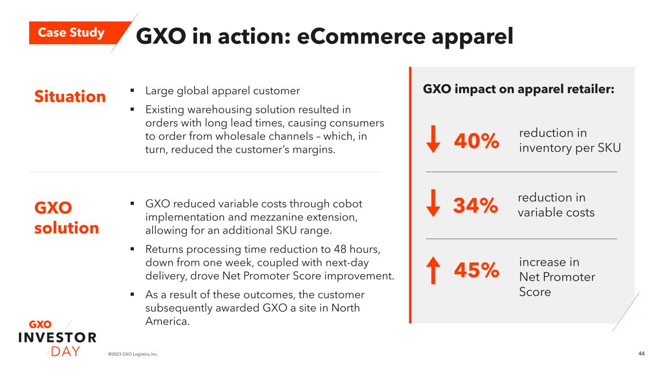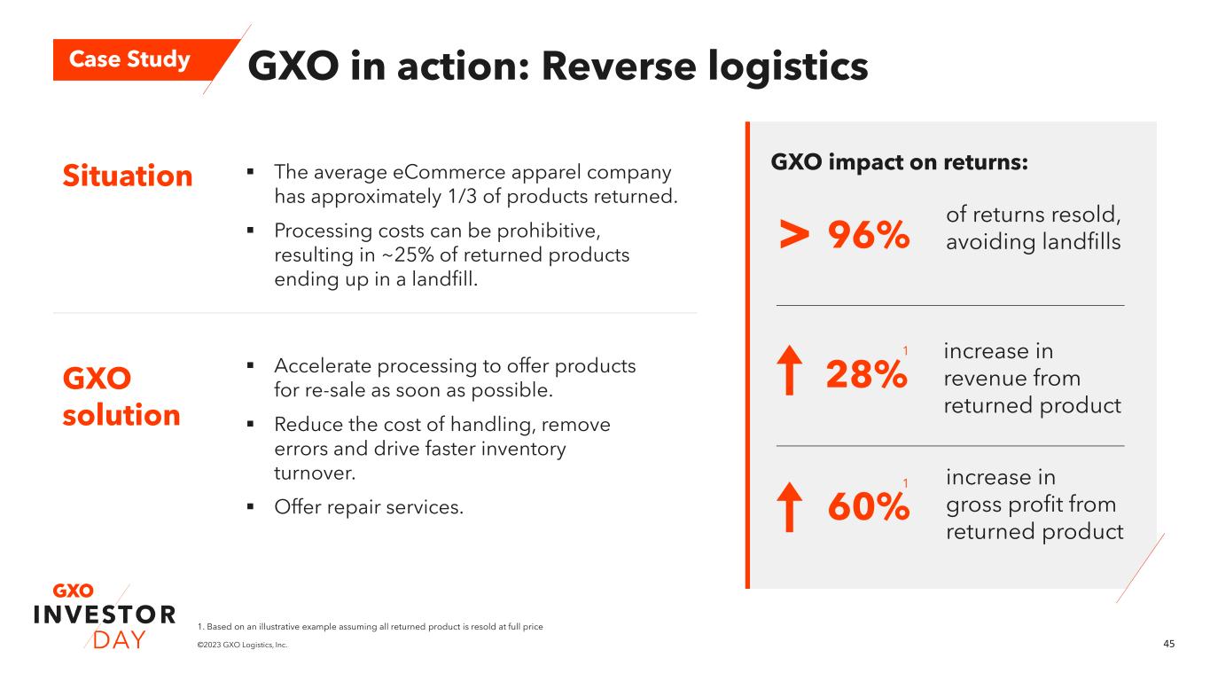 44©2023 GXO Logistics, Inc. GXO in action: eCommerce apparel GXO solution Situation ▪ Large global apparel customer ▪ Existing warehousing solution resulted in orders with long lead times, causing consumers to order from wholesale channels – which, in turn, reduced the customer’s margins. Case Study GXO impact on apparel retailer: 40% reduction in inventory per SKU 34% reduction in variable costs 45% increase in Net Promoter Score ▪ GXO reduced variable costs through cobot implementation and mezzanine extension, allowing for an additional SKU range. ▪ Returns processing time reduction to 48 hours, down from one week, coupled with next-day delivery, drove Net Promoter Score improvement. ▪ As a result of these outcomes, the customer subsequently awarded GXO a site in North America.